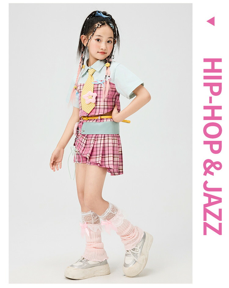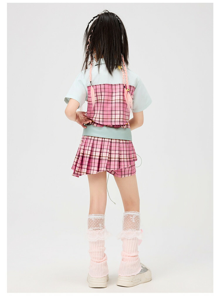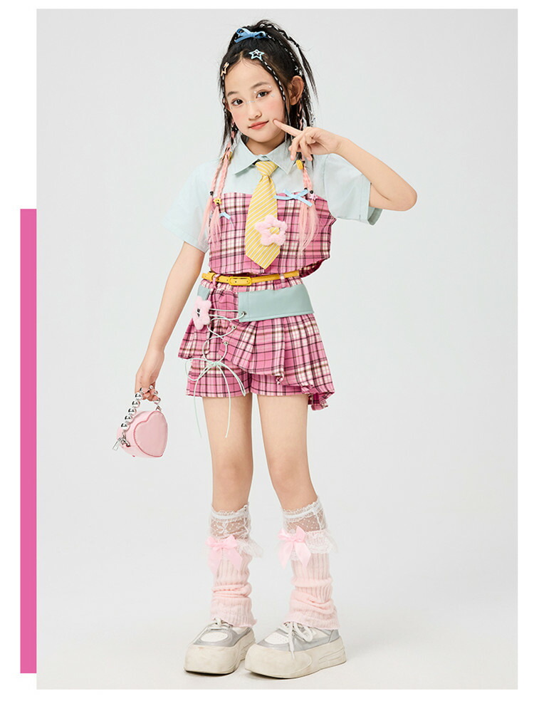 ピンク タータンチェック へそ出し 半 キッズ ベビー マタニティ 新作 四点セット 六点セット シャツ+ネクタイ スカート+ベルト 110 120 130 140 150 160 170 180