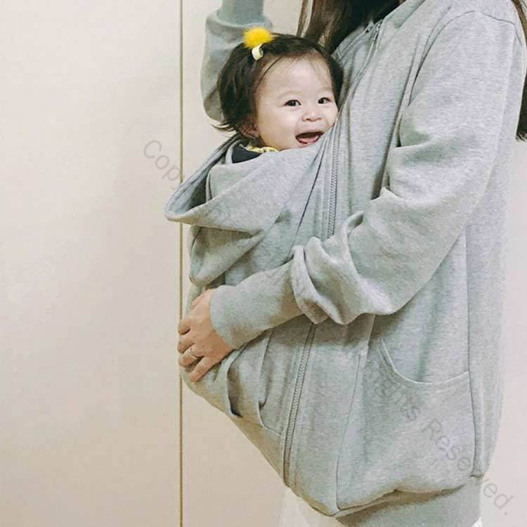 赤ちゃんを抱っこしたまま羽織れるダッカー付きパーカー。裏起毛なのでママとベビーを暖かく包んでくれます。お腹の大きい妊娠期間なら臨月まで、ファスナーでダッカーをコートにつけるタイプのこちら。ダッカー付きなので赤ちゃんも一緒に包み込んであったか。フードつきで頭から足先まで赤ちゃんを寒さから守ります!ファスナーで簡単に取り外しができるので、電車やバスの中での赤ちゃんの体温調節もでき快適に過ごせます♪裏起毛なのでママもお子様もあたたかく過ごせる優秀アウターです。大きいサイズも用意しており、パパにも使えて長く着回しができます。