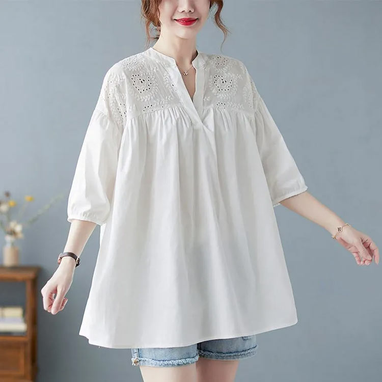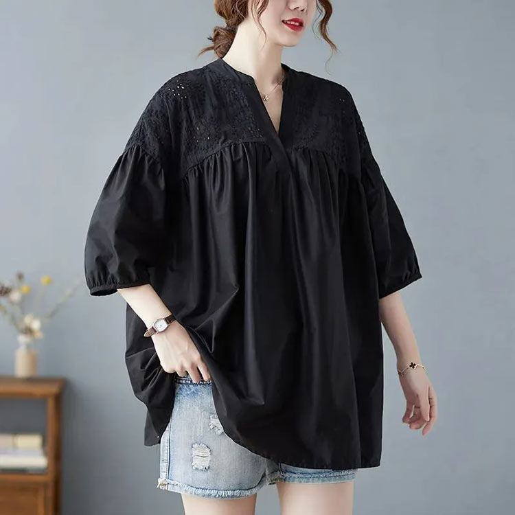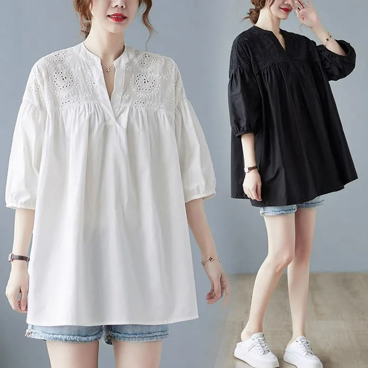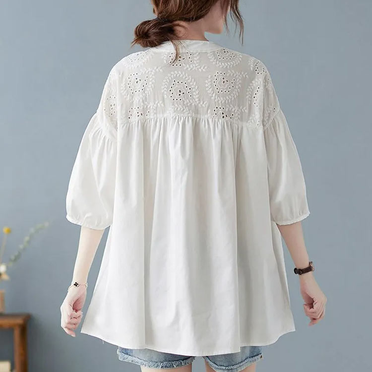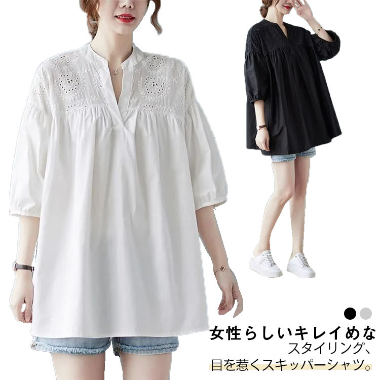 スキッパーシャツ 花柄モチーフ バルー トップス シャツ ブラウス 新登場! ブラック ホワイト