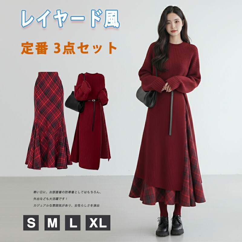 ニットセットアップ 秋冬 レディース スーツ セットアップ ワンピーススーツ 新登場! ニットワンピース+スカート+ベルト ニットワンピース+ベルト S M L XL