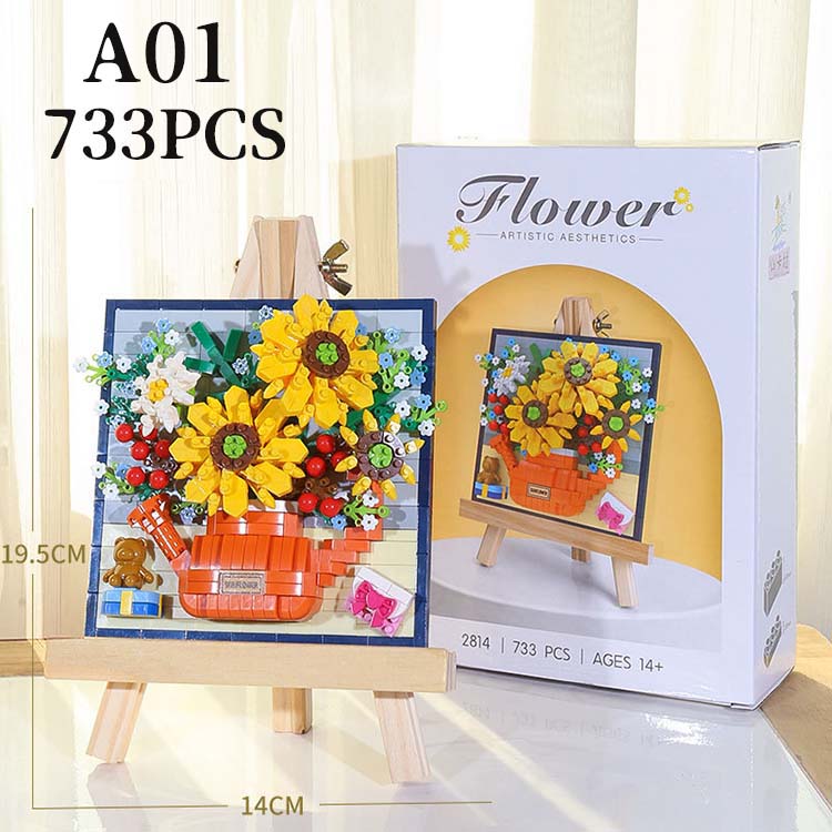 ミニブロック レゴアート フラワーアート 木製イーゼル付き ひまわり 青いカーネーション バラ ピンクカーネーション ゆり