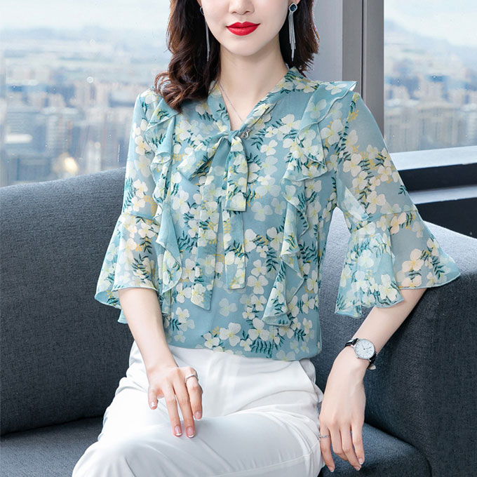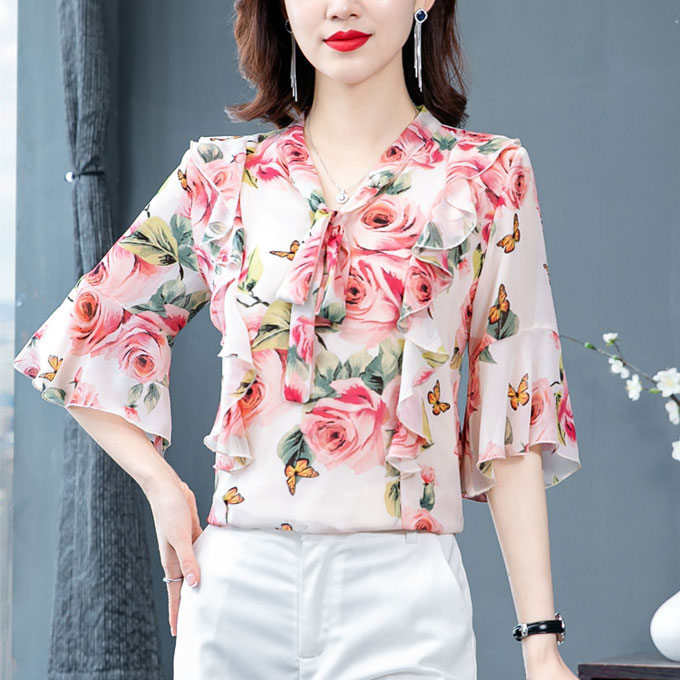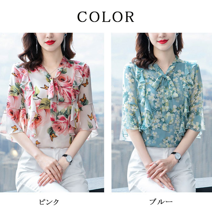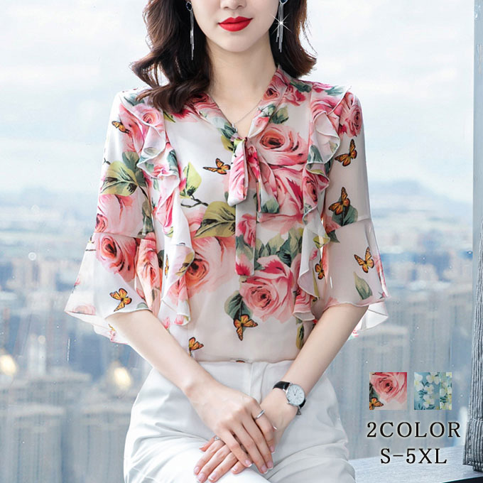 シフォンブラウス レディース 薄手花柄 トップス シャツ ブラウス 超目玉商品 ブルー ピンク S M L XL 2XL 3XL 4XL 5XL