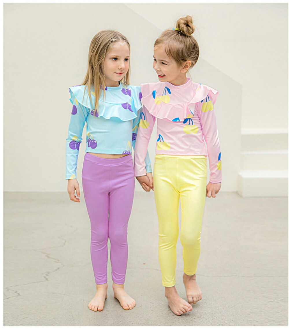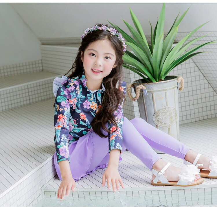 キッズ 水着 女の子 セパレート 子供水着 ラッシュガード UVカット フリル リボン 女子 女児 ジュニア 長袖 トップス ロングパンツ スイムウェア 上下 スイミング 水遊び 子ども 2点セット