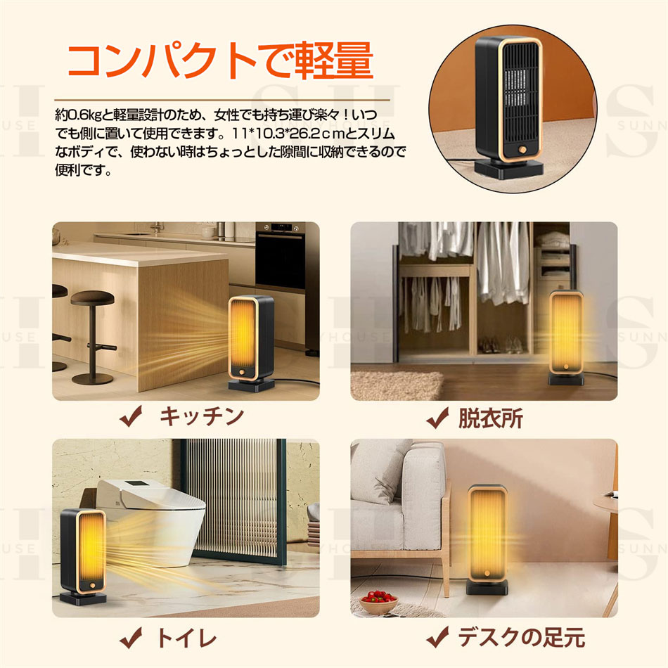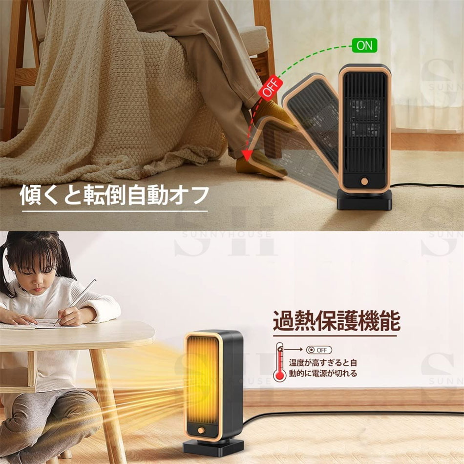 【五つの安全対策】1.温度ヒューズ:過剰に暑くなり過ぎた場合、自動で発熱を感知し,回路を遮断します。2.転倒時自動OFF機能:傾斜角度が15度より大きいにすると、底部のスイッチが、感知すると運転を停止します、安全の役割を果たします。3.セラミックヒーター:灯油等の燃料を燃やすファンヒーターとは異なり、電気でセラミックを発熱させ空気を温めるので有害な排気ガスが出ません。換気する必要がなく、狭い場所での長時間使用も可能です。4.防火素材:本品はABS素材を採用して、火事を効果的に防止できます。5.主スイッチ付き:前面にはスイッチがあります。ワンクリック起動;