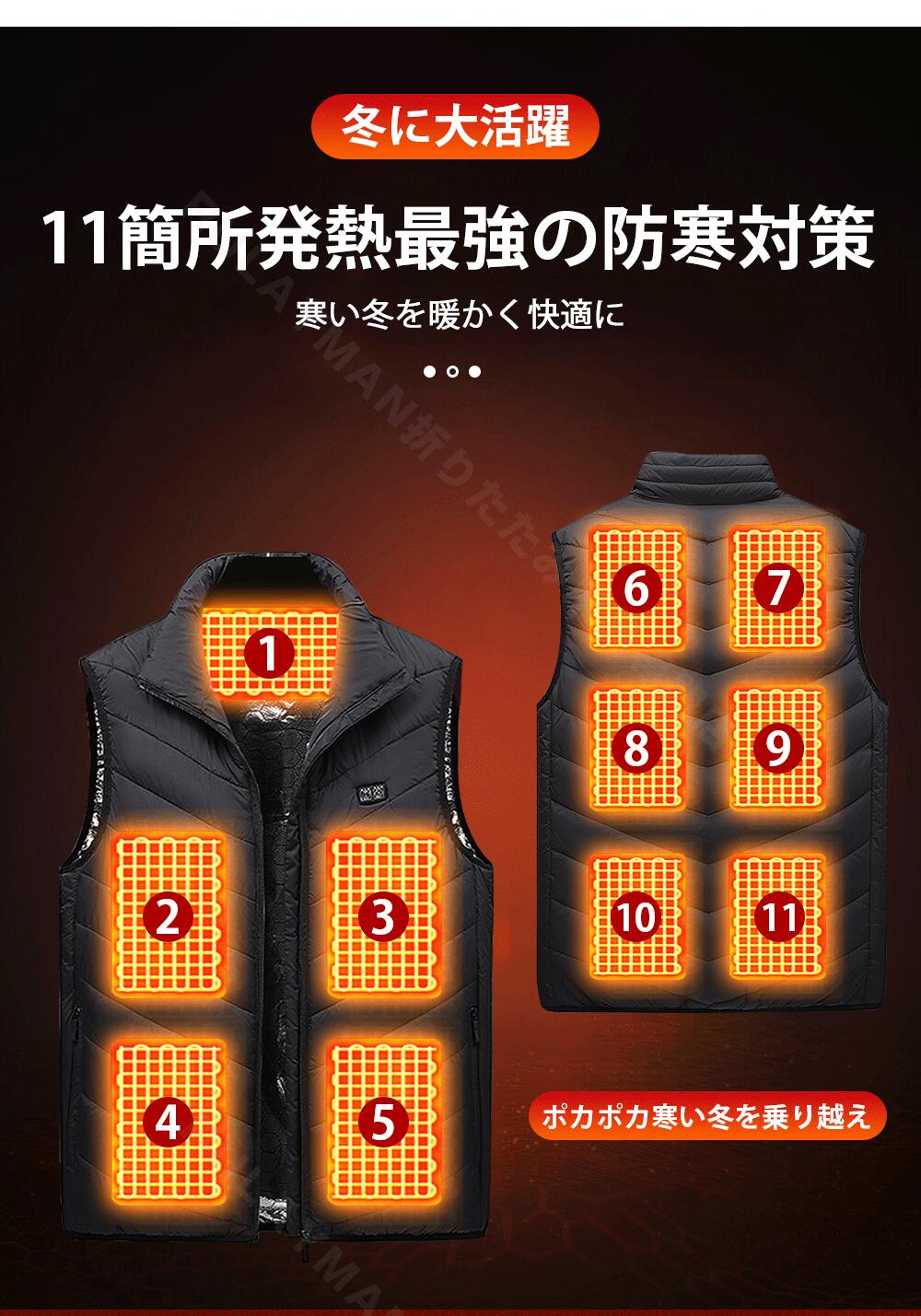 電熱ベスト ヒートジャケット バイクウェア 加熱パネル11枚 温度調節可能 加熱ベスト ヒーター ヒーターベスト USB充電式 電熱ジャケット ベスト 中綿 速暖 洗える 電熱ウェア L XL X M