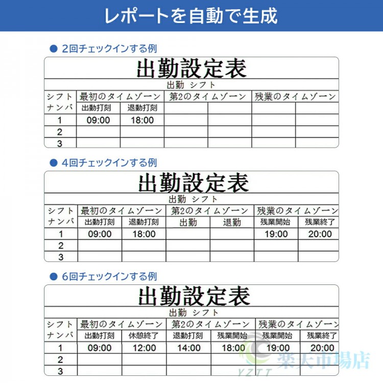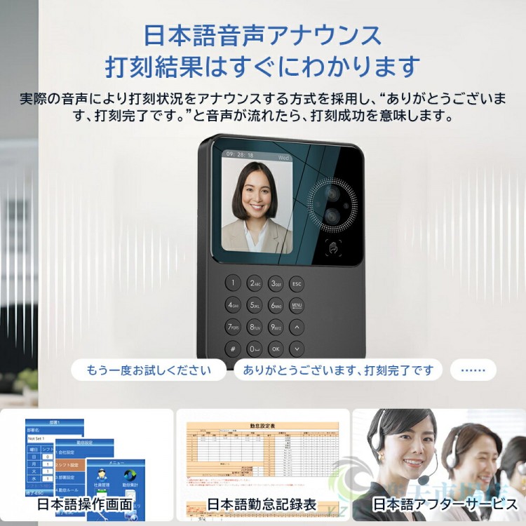 このタイムレコーダーは日本企業向けに特別に設計されており、日本語音声付きで使いやすいです。会社の勤怠プロセスを簡素化し、社員の通勤時間と勤怠データを自動的に記録し、手動の記録と検証の時間コストを削減し、作業効率を向上させます。勤怠データを通じて記録および分析することで、社員の働き方とリソースの利用状況をよりよく理解できるようになり、リソース配分の最適化とコスト削減につなげることができます。