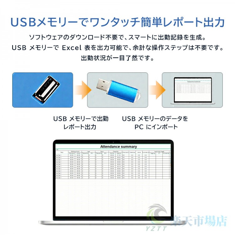このパスワードタイムカードレコーダーは、USBドライバーレス直結に対応し、プラグアンドプレイで利用可能。FAT32形式のUSBメモリと互換性があり、最大120,000件の勤怠記録を迅速にエクスポート可能です。タイムカード機械の記録を簡単ダウンロード、素早くレポートを生成できるため、企業の勤怠管理効率を向上させます。
