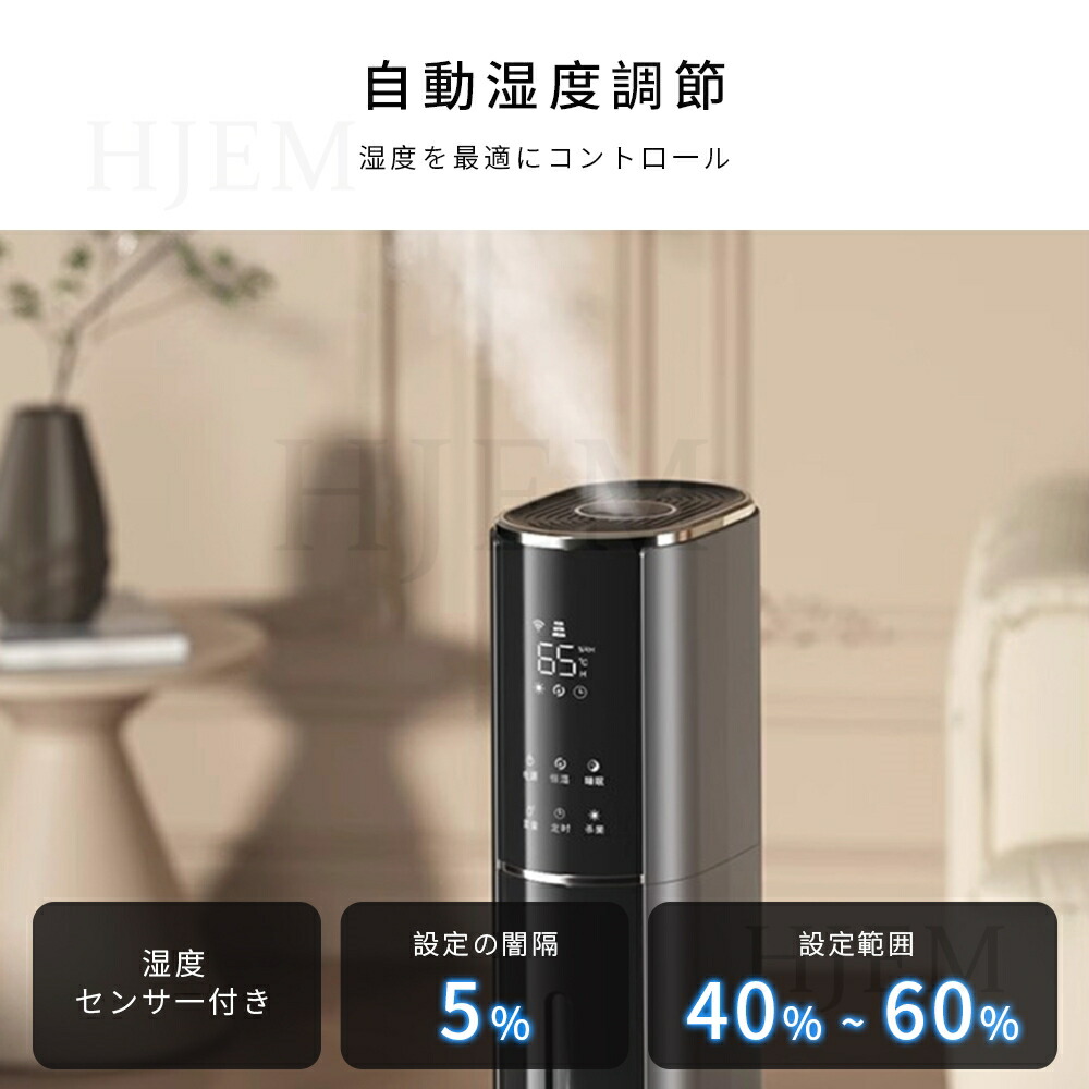 3 段階(300ml/h):秋冬の乾燥シーズン用急速加湿、短時間で乾燥環境を改善します スマート恒湿システムを搭載し、デフォルトで湿度 40% を起点とし、5% 刻みで 90% まで調整可能。設定後、機器は自動的に環境湿度を監視し、湿度が目標値に達すると噴霧を一時停止し、目標値を下回ると自動的に再起動して、快適な湿度範囲を精密に維持します。特別注意:過度な加湿はカビの発生を助長しやすいため、季節に応じて調整することを推奨します(冬季は 40%-60%、夏季は 40%-50% が適切です)。室内の湿気が過度に高くなることを避けてください。