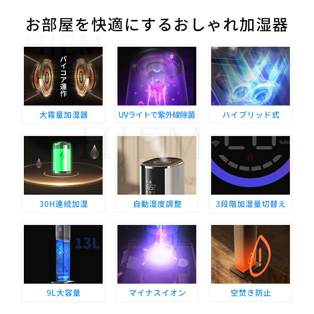 加湿器 超音波式 大容量 タワー型 uv除菌 マイナスイオン 9L 4重除菌 48H連続運転 自動湿度調節 空焚き防止 上部給水 スチーム式 空気清浄機 上から給水 花粉 省エネ 最大噴霧量3 静音