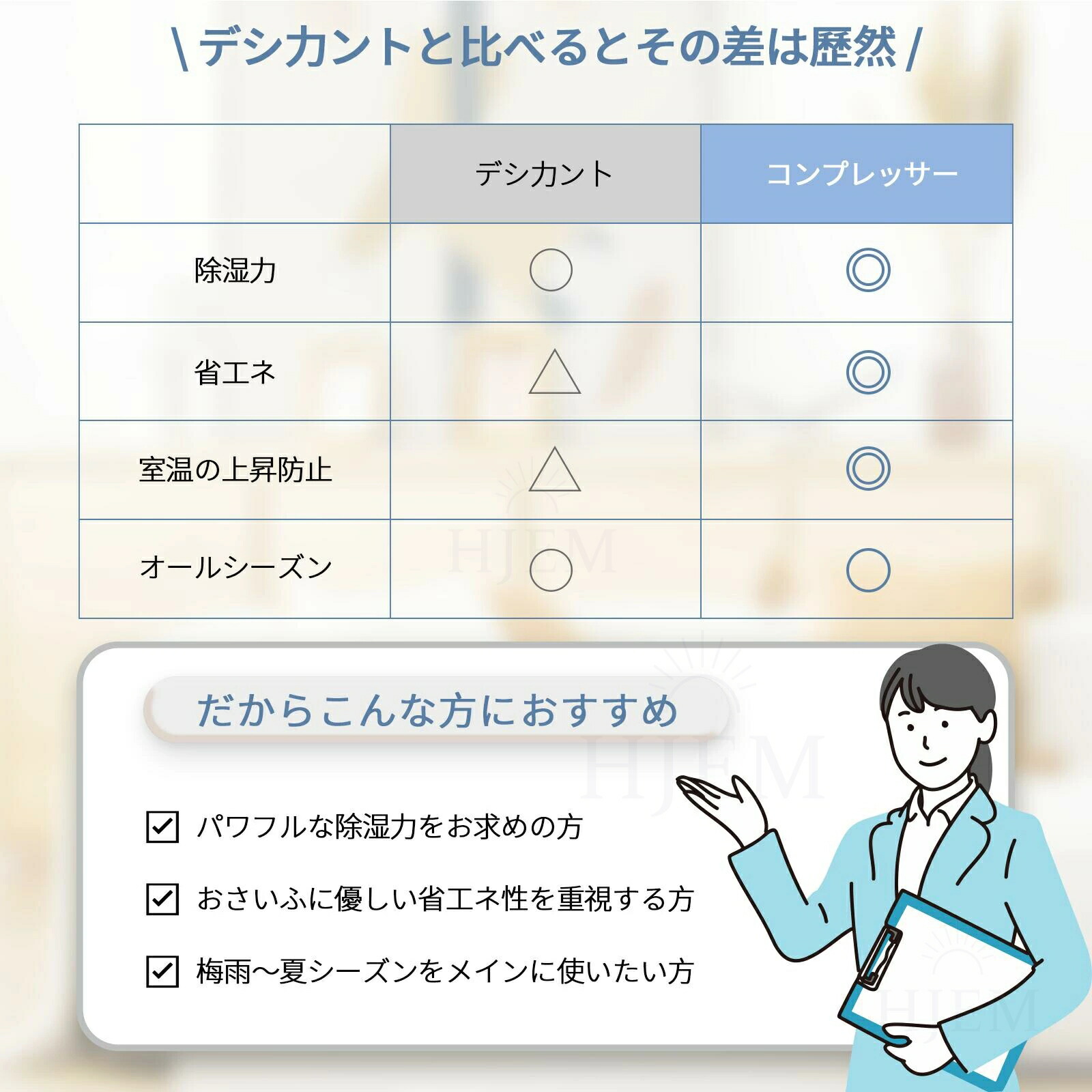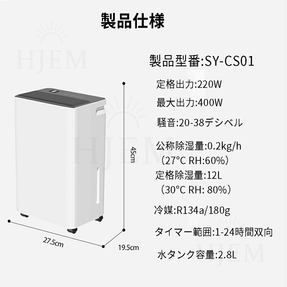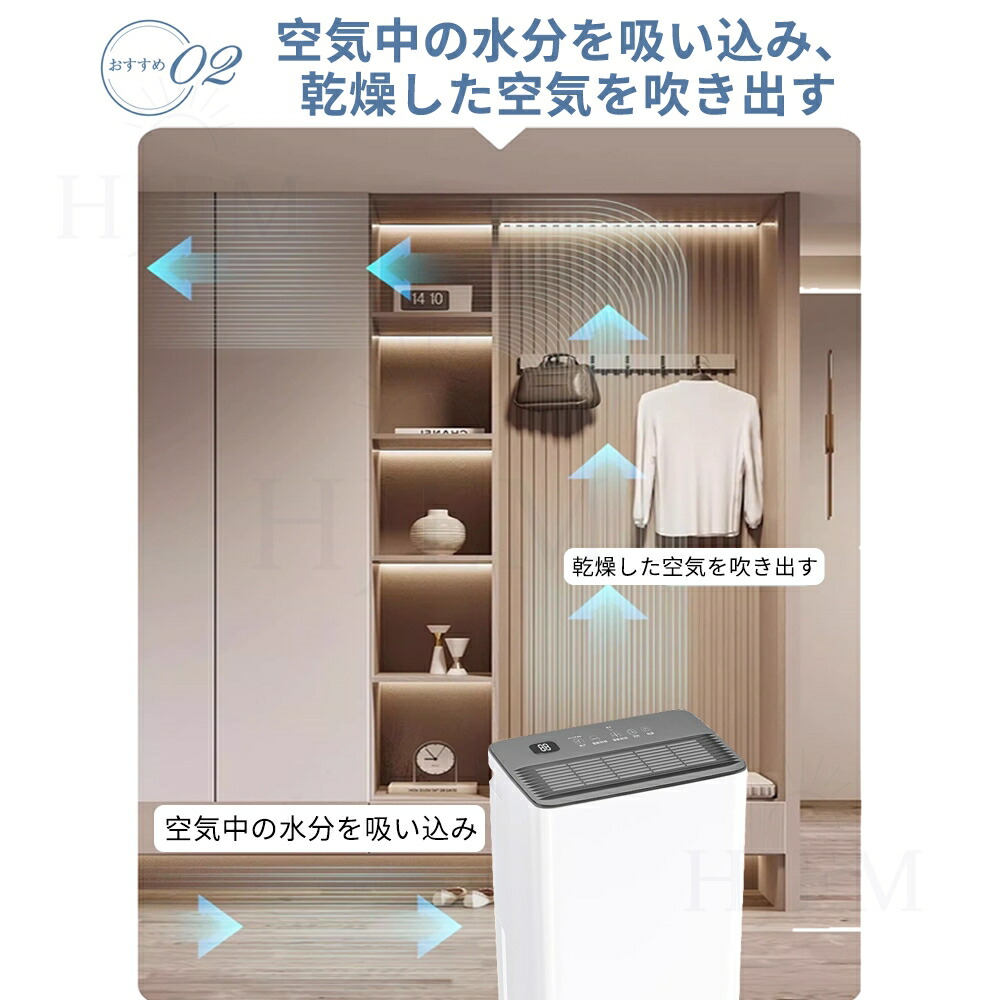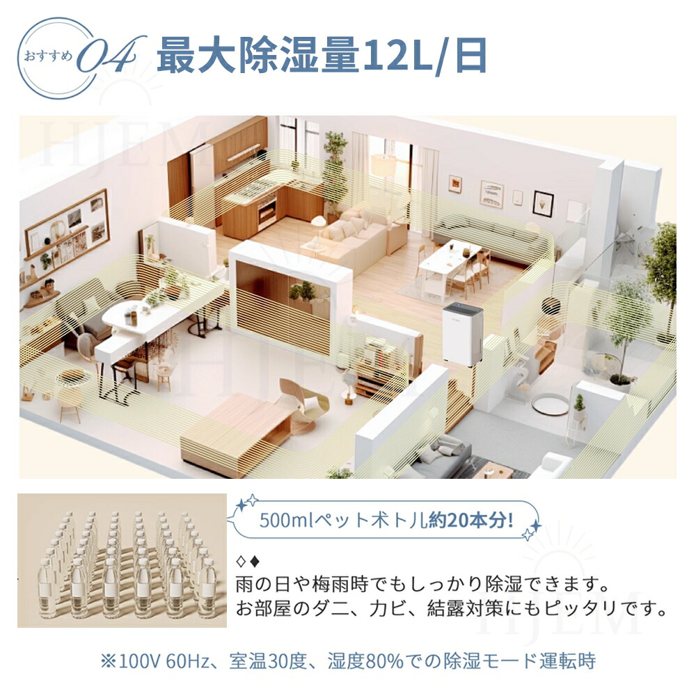 じょしつき 部屋 小型が室内の湿った空気を吸い込んで、コンプレッサー式用いて湿気を取り除きます。除湿力最大約12000ML/日です(※室温30℃、相対湿度80%を維持し続ける環境条件でテスト)。室温・室湿が高くなるほど除湿力が高くなるので、高温多湿な季節に、狭いスペースの湿気・カビ対策として、このじょしつきが最適。