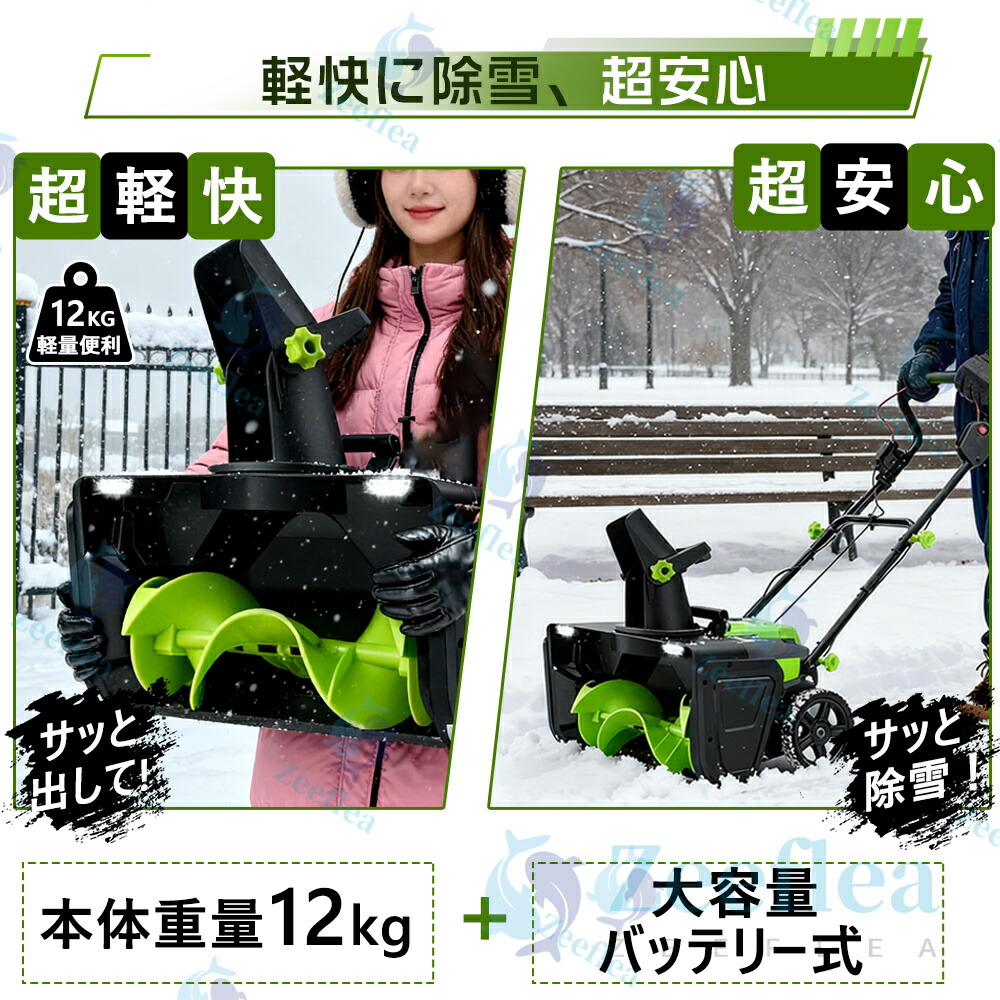 軽量でコンパクトなデザインにより、小型除雪機として、女性や高齢者でも簡単に操作できます。除雪機 家庭用に最適な設計で、電動除雪機 スコップのような簡単な操作で、誰でも手軽に使えます。電動スコップとしても、非常に効率的に作業ができます。人間工学に基づいたハンドル設計で、長時間使用しても疲れにくく、作業が快適です、わずか12.15kgの軽量ボディにより、作業中や収納時の移動も簡単。女性や高齢者でも扱いやすい優れた携帯性を備えています。操作が簡単な手押しタイプ、手押しで操作できるシンプルなデザイン。初心者から経験者まで、誰でも直感的に扱える設計で、体への負担を最小限に抑えます。