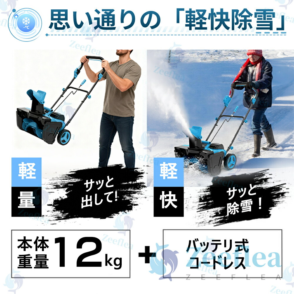 軽量でコンパクトなデザインにより、小型除雪機として、女性や高齢者でも簡単に操作できます。除雪機 家庭用に最適な設計で、電動除雪機 スコップのような簡単な操作で、誰でも手軽に使えます。電動スコップとしても、非常に効率的に作業ができます。人間工学に基づいたハンドル設計で、長時間使用しても疲れにくく、作業が快適です、わずか12.15kgの軽量ボディにより、作業中や収納時の移動も簡単。女性や高齢者でも扱いやすい優れた携帯性を備えています。操作が簡単な手押しタイプ、手押しで操作できるシンプルなデザイン。初心者から経験者まで、誰でも直感的に扱える設計で、体への負担を最小限に抑えます。