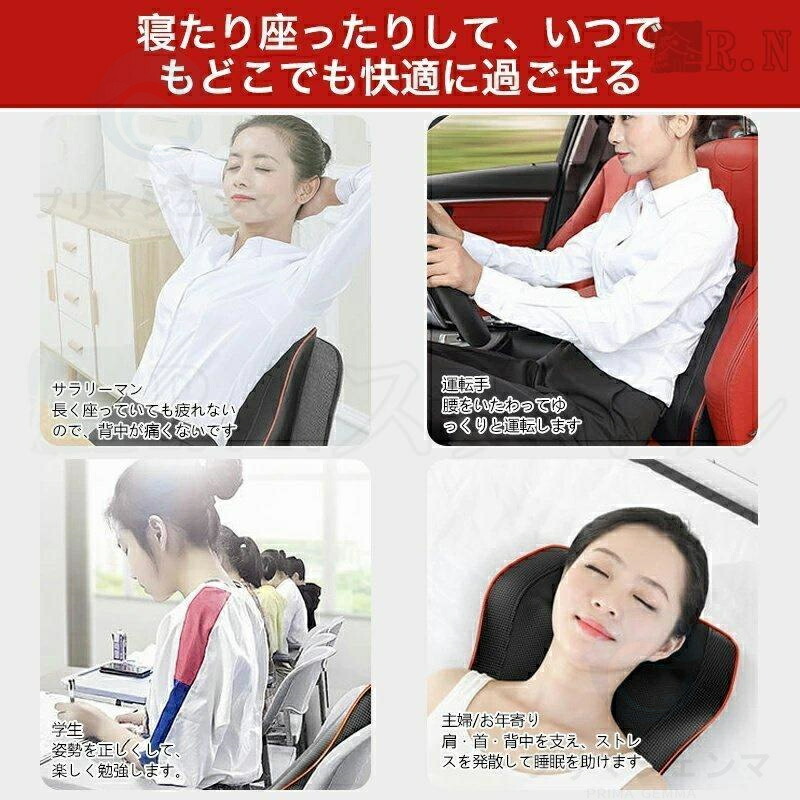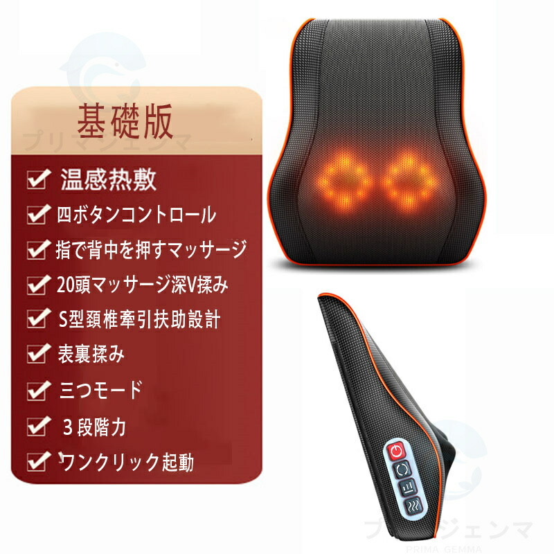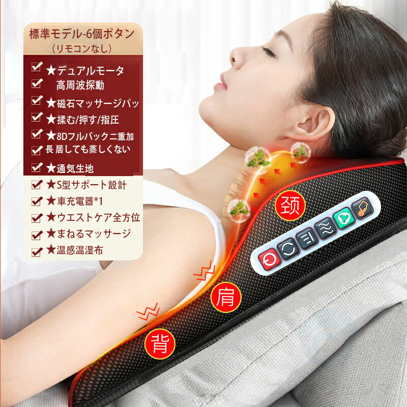 おすすめのポイント:三段階調節/ヒーター付/家庭・車載両用可能/コンパクト/簡単操作/3D揉み玉/人の手を模擬する/温熱機能/スマホ首を予防する/タイマー/人体工学設計/多機能/通気性良い/変形しにくい