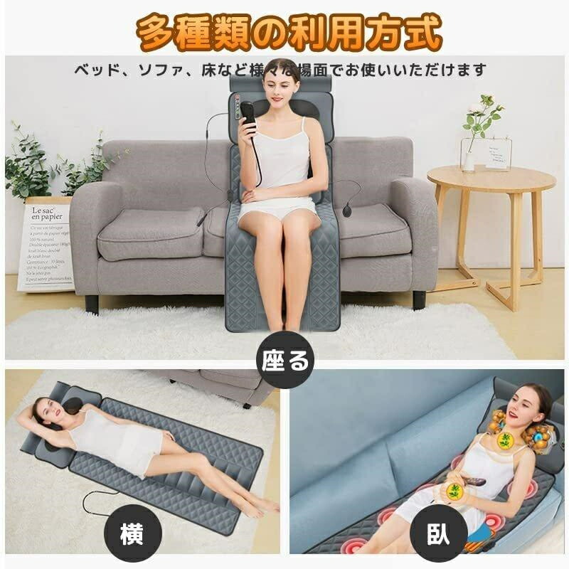 人間工程学に従って、マッサージクッションの外観が中部凹面曲線に設計されて、全身の周りをよくフィットし、サポートします。凹面抱き寄せる設計で、体の形をよく固定し、腰椎曲線を維持し腰部の圧力をリリースします。先進的、安全的な牽引原理や指圧風マッサージと合わせて、体の曲線に合わせて、腰の周りによくフィットして、腰部の圧力をリリースし、簡単的に操作できます。しかも、おしゃれな外観、高級感がいっぱいあって、ご両親、親友、上司などの最優選プレゼントです。 全身マッサージパッド-温め式振動枕マッサージ器 肩と背中の痛みからストレスと緊張感の振動を緩和します。全身マッサージパッドは暖かいマッサージを提供します。 背中の肩と腰、あなたの組織と筋肉をリラックスさせます。一般的な使い方-マットレスはベッド、ソファー、ソファー、寝椅子、椅子の上でマッサージを楽しむことができる柔らかい折りたたみ式です。 マッサージパッドにはリモコンがあり、横になって目的の機能を設定できます。リモコンはマッサージクッション側のストレージバッグに格納することができます。