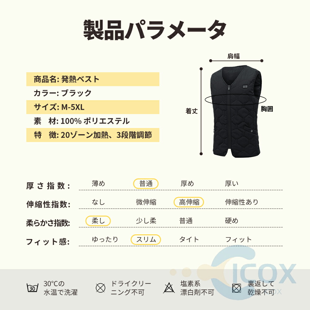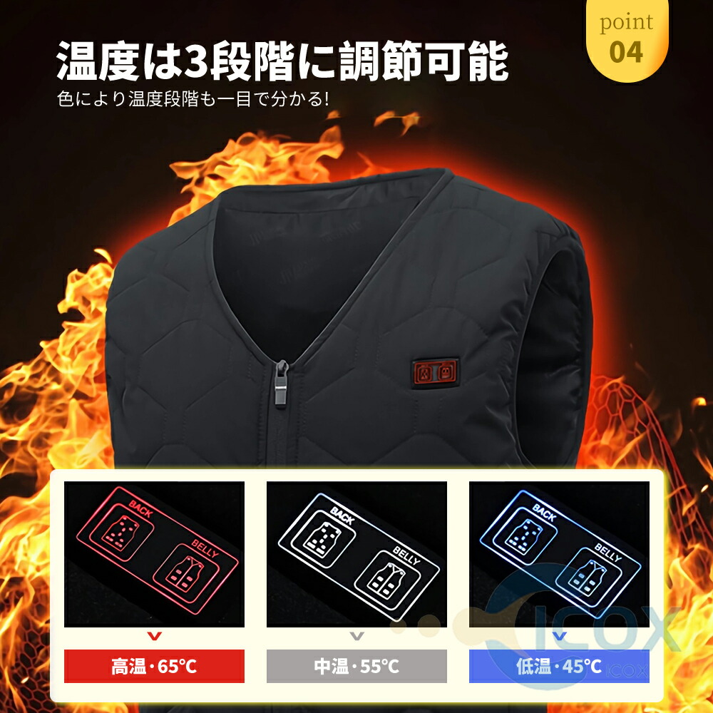 ※電熱ベストには恒温保護作用があります。プラグを挿してから3-5分后、自働的に高温から低温に切