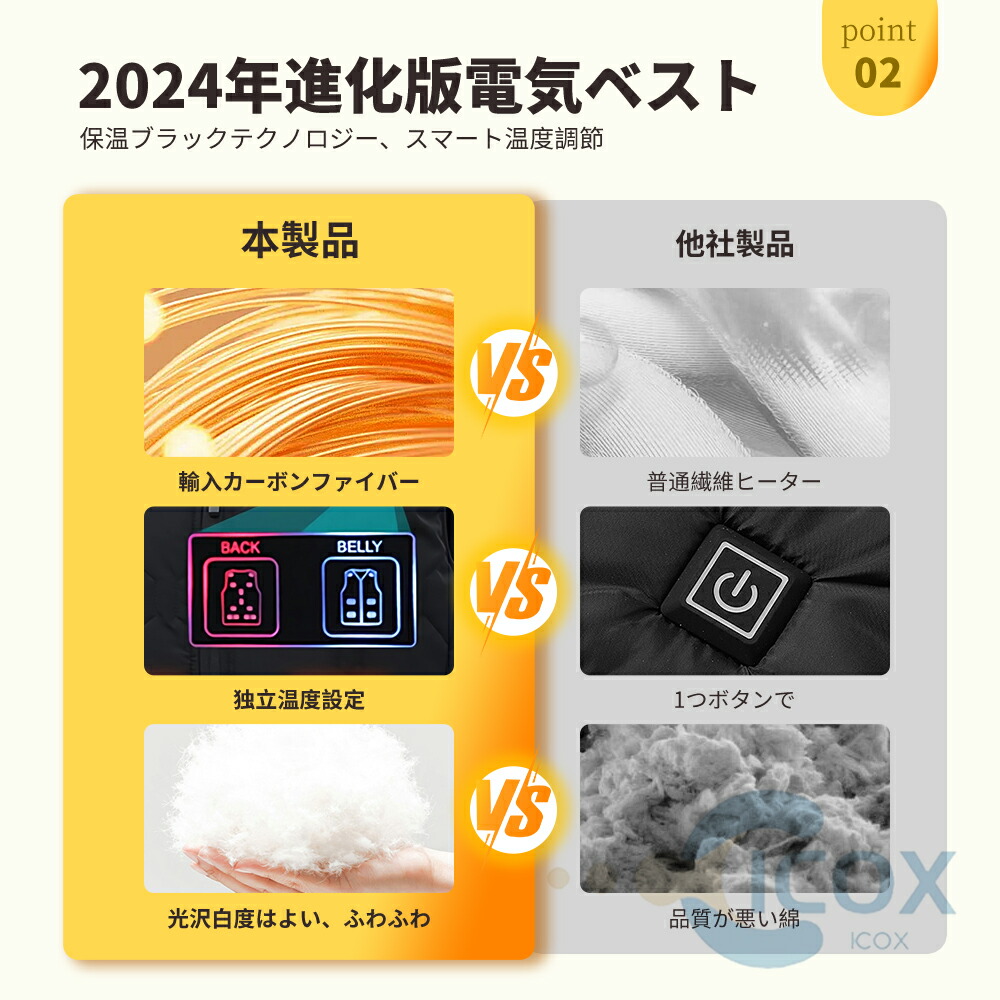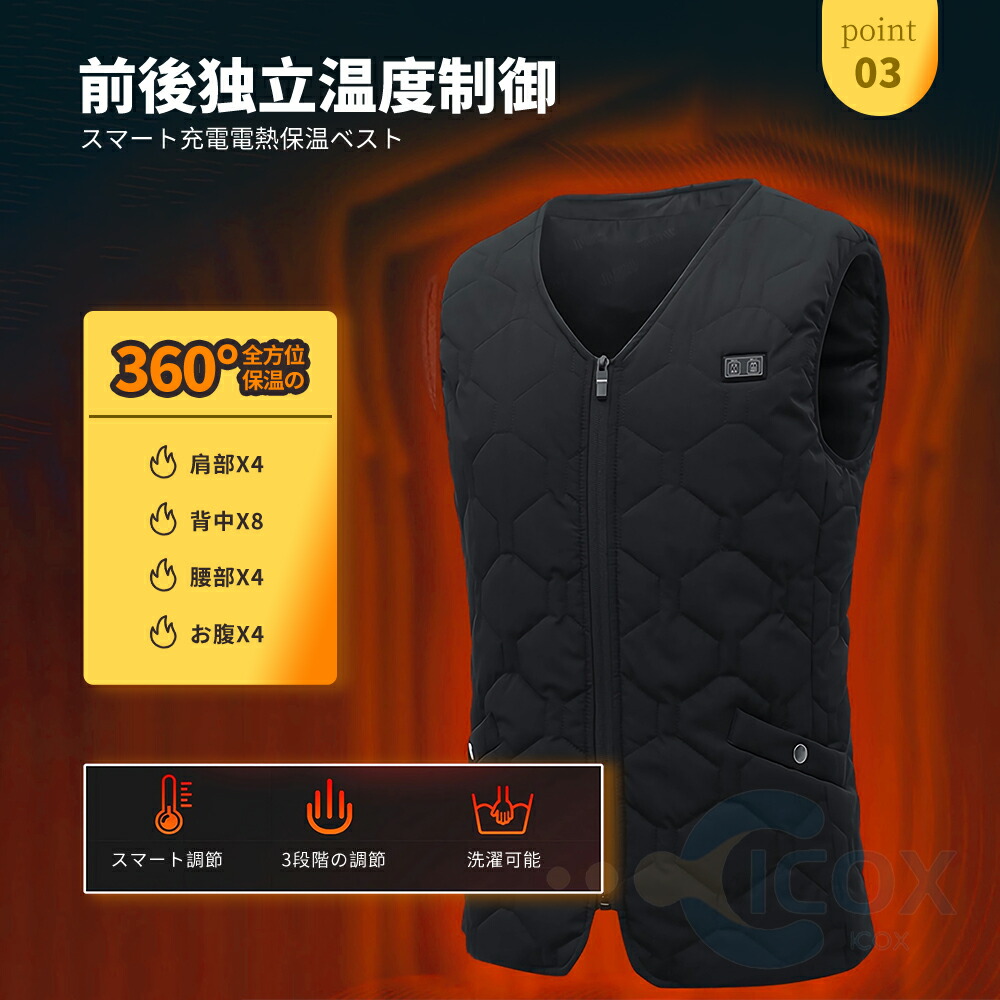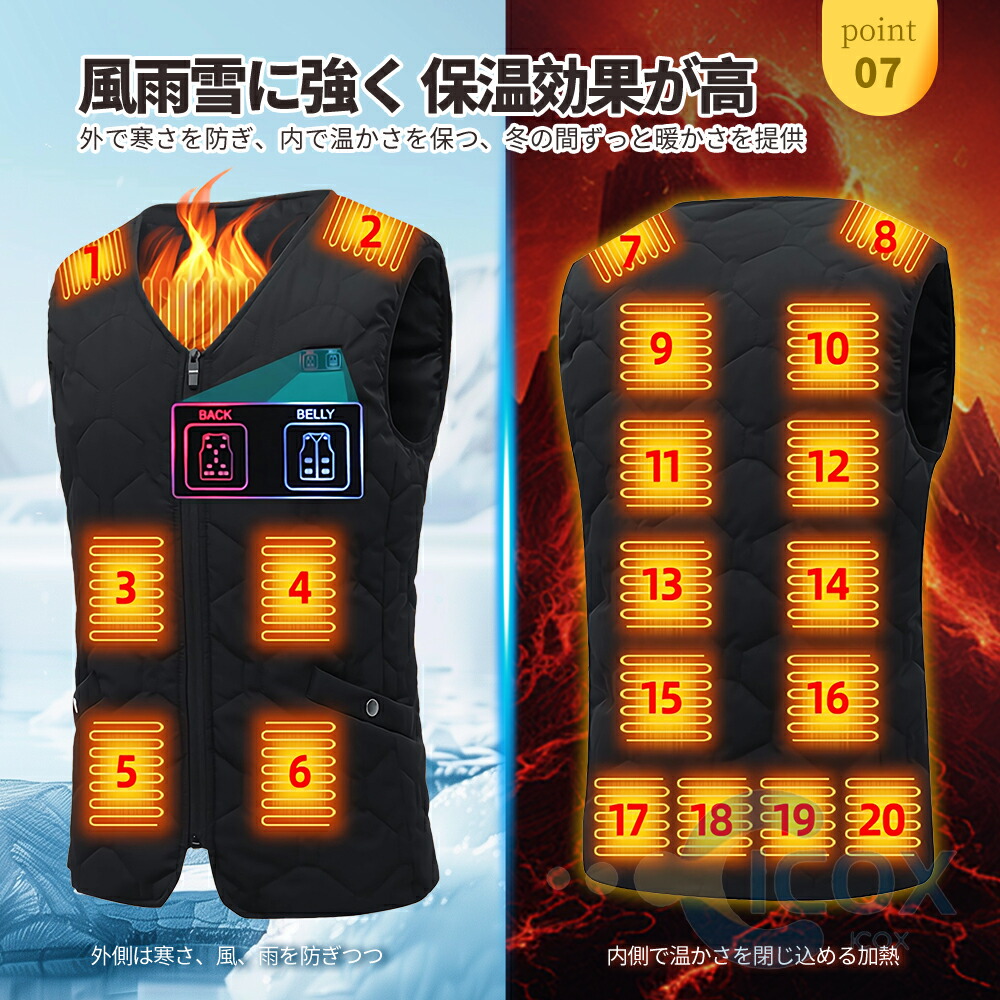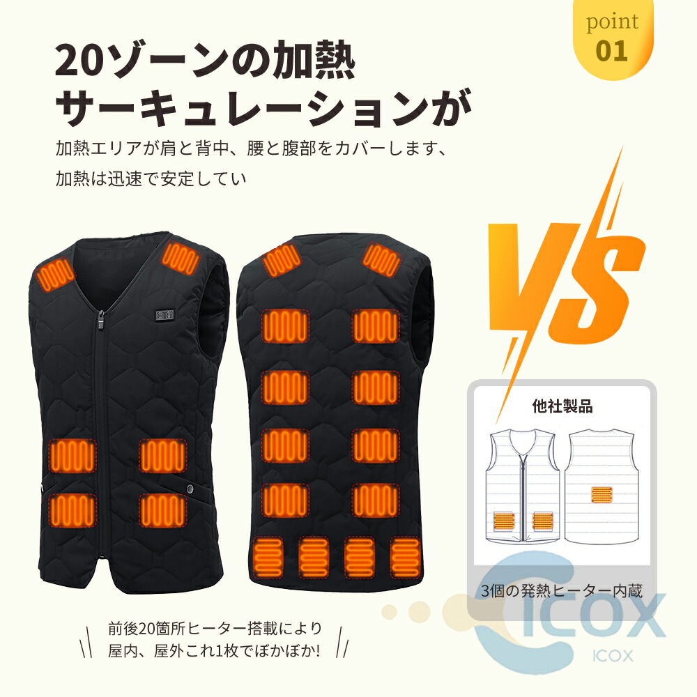 【2つのスイッチ独立 ,前後20箇所加熱】前後17つの加熱ヒーターが内蔵され、20箇所を効率よく温まり、4つのスイッチ独立、 寒い季節の給電式ベストです。、男女兼用で、通勤通学など普段使いはもちろん、登山などのアウトドア活動までも大活躍、冬を思う存分楽しむことができます。