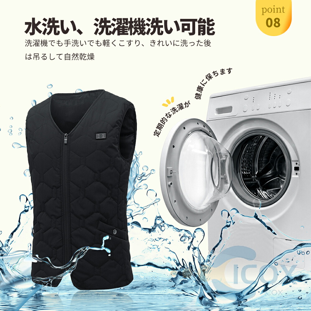 【洗濯機/手で洗う】汚れたら、バッテリーを外して、洗濯機/手で洗う可能です。使用する前に、洗った服を自然に乾かしてください。手洗うことや洗濯機で両方洗えます。二つの方法とも加熱服の内部発熱システムに影響を与えません。(洗濯機を使用する場合必ず洗濯ネットに入れてください)。