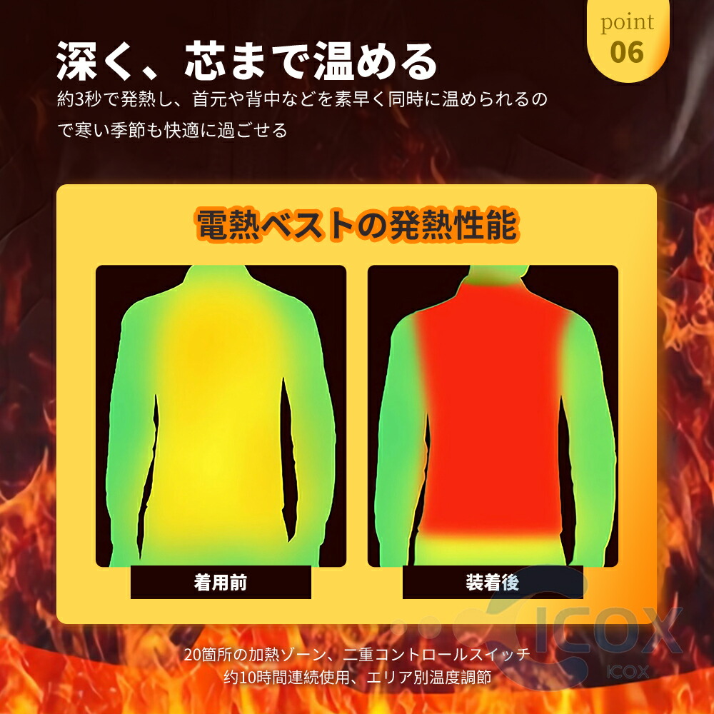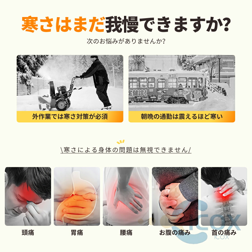 肩にさらに2つの発熱シートが追加され、肩をよりよくケアできます。 腹部をよりよくケアするために、さらに2つの加熱パッドが腹部に追加されます。 背中にさらに2枚の発熱シートが追加され、背中をよりよくケアできます。 20枚の発熱シートを使用しているので、着るだけで全身ポカポカになります。