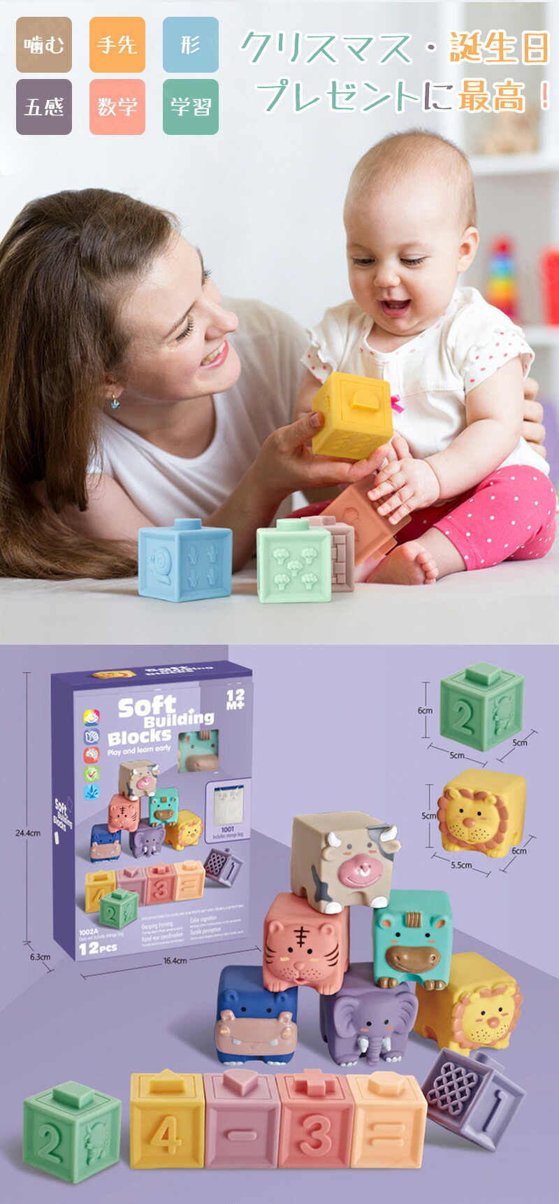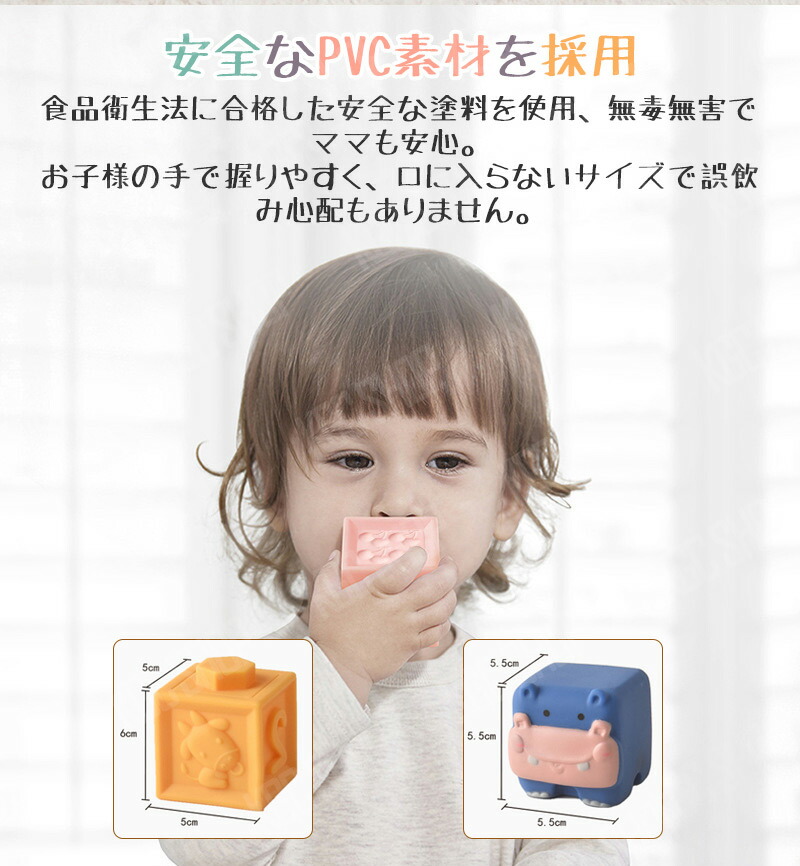 12ピース 音の出るおもちゃ ブロック 知育玩具 ベビー 赤ちゃん 積み木 つみき 柔らか積み木 6か月 0歳 1歳 2歳 室内 遊び おもちゃ 音が鳴る お風呂遊び 数字 動物 虎 男の子 女の 牛