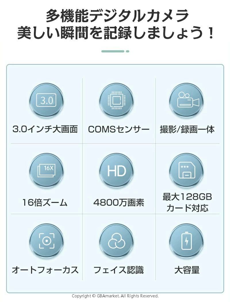 【オートフォーカスデジタルカメラ】最新のオートフォーカスデジタルカメラが登場!従来品と違い、4800万の高画素を搭載し、4Kの動画解像度を実現します。「AF機能:シャッターボタンをタッチしてピントが自動的に合わます。フォーカスフレームは黄色から緑色に変わってそのまま押して撮影できます」。操作性は簡単ですから、デジカメの入門機として初心者や学生にも簡単に綺麗な写真を撮れます。