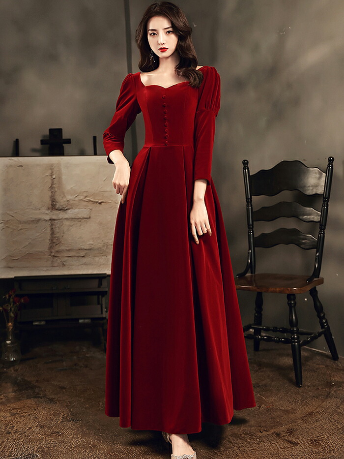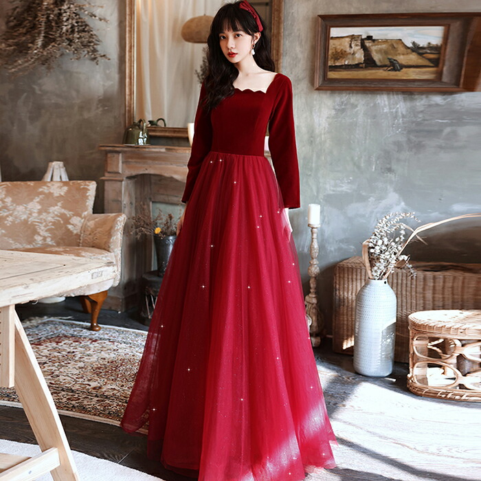 カラードレス 長袖 赤 演奏会用ドレス ロングドレス パーティードレス 演奏会 イブニングドレス 結婚式 カクテルドレス 花嫁 フォーマルドレス 二次会 お呼ばれ ワンピース 発表会 Aラインドレス