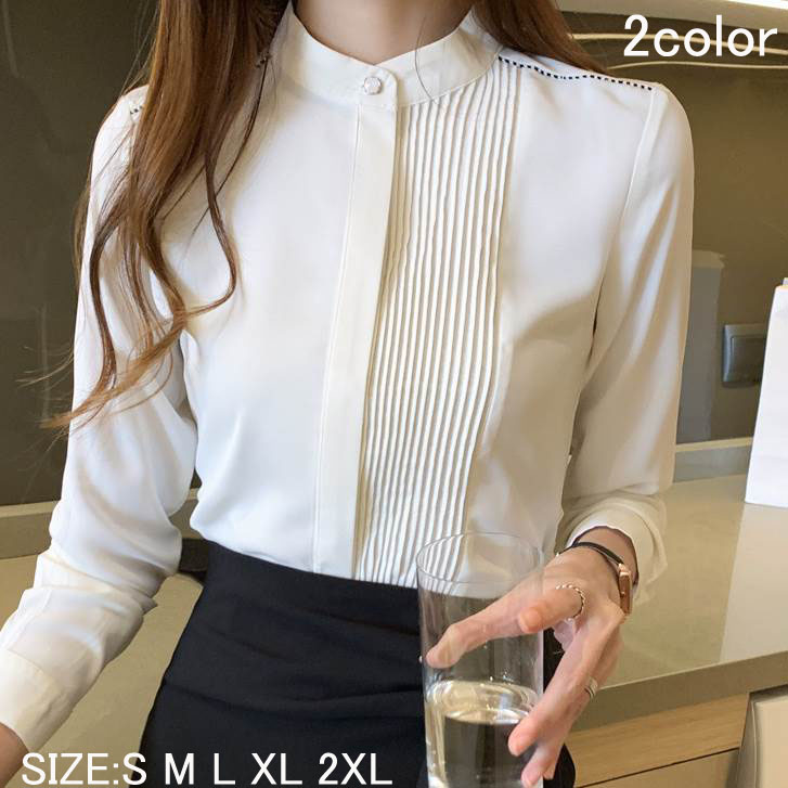 長袖 ラーシャツ トップス レディース ブラウス 白シャツ 個性的 春 秋 裾イン 前開き シフォン ボタン カラバリあり ホワイト グリーン 無地 サイズ豊富 オフィス 学校 式典 薄手