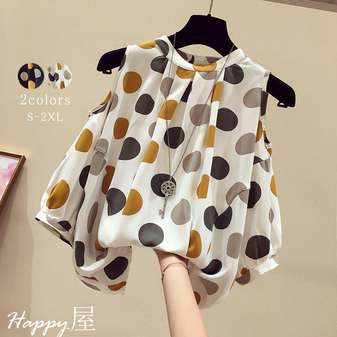 シフォンブラウス 丸首 半袖 肩開け ドット柄 トップス