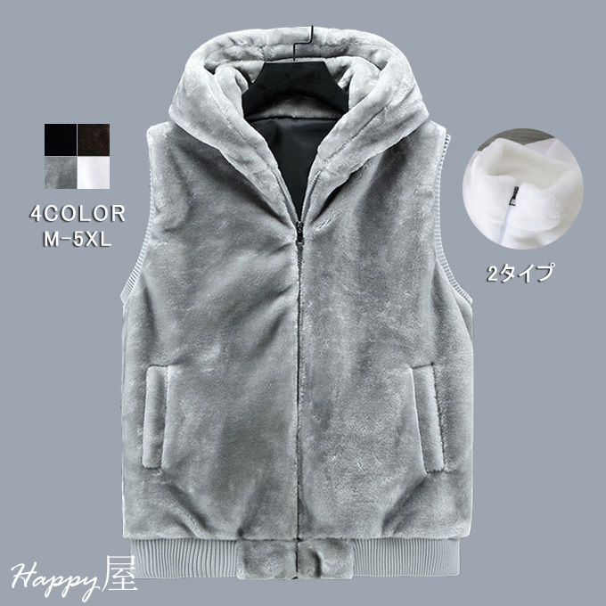 ファーベスト メンズ 毛皮ベスト ショート丈 ミンク風 フェイクファー 2タイプフード付き 立ち襟 アウター 暖かい 冬物 防寒 人気 秋冬 新作 上着