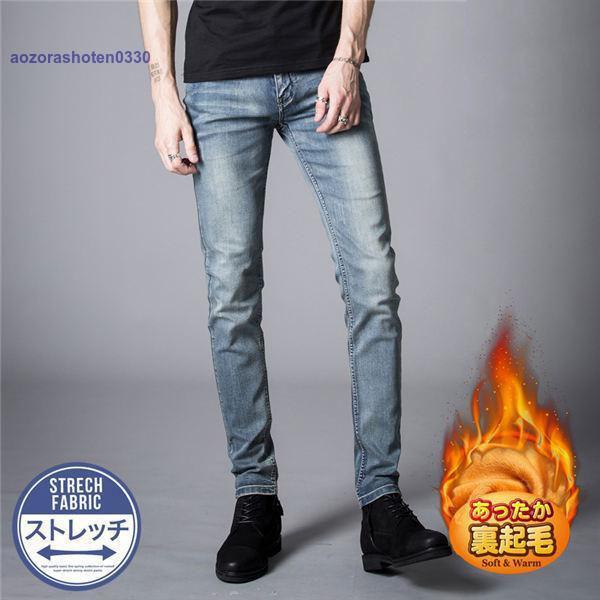 スキニーパンツ メンズ 暖ズボン デニムパンツ ジーパン ジーンズ 裏起毛パンツ ネイビー 色むら 厚手 美脚 小尻 秋冬 暖かい