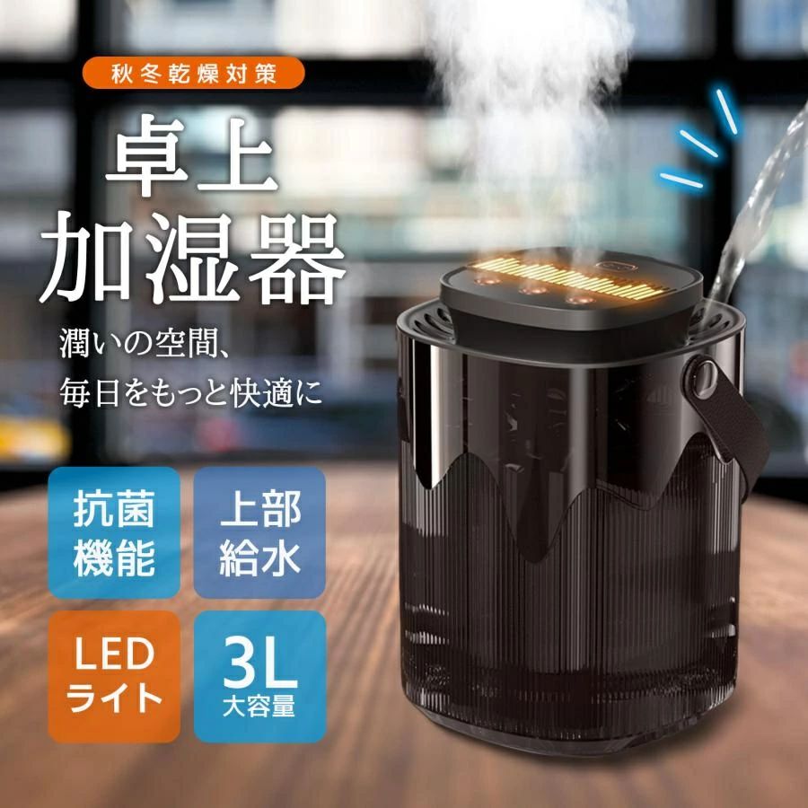 & 3つの噴出口 】 加湿器 卓上 3L 加湿機 6畳 超音波式 上から給水 3000mah 無階段ミスト調整 アロマ