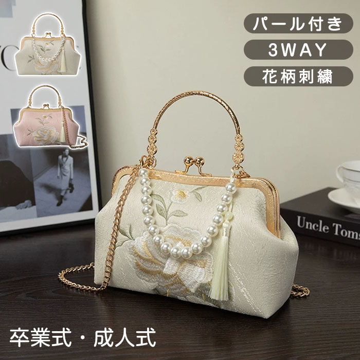 パーティーバッグ 卒業式バッグ レディース 成人式 バッグ 花柄刺繍 フォーマルバッグ 学生 入学式 パール付き 3WAY 結婚式 袴 和装バッグ 手提げバッグ おしゃ がま口