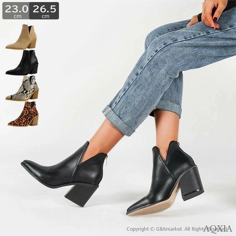 ショートブーツ ブーティ ブラック ローヒール ブーティー vカット ショートブーティ レディース ポインテッドトゥ 黒 ベージュ ヒョウ柄 靴 太ヒール チャンキーヒール パイソン