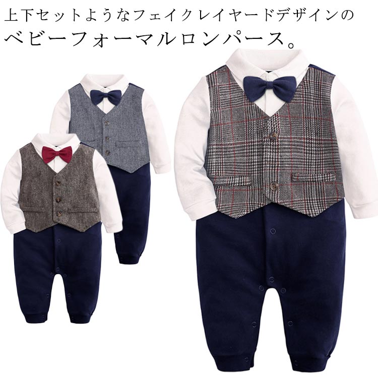 男の子 長袖 子供服 上下セットようなフェイクレイヤードデザイン ロンパース 赤ちゃん つなぎ フォーマルスーツ 誕生日 100日 お宮 結婚式