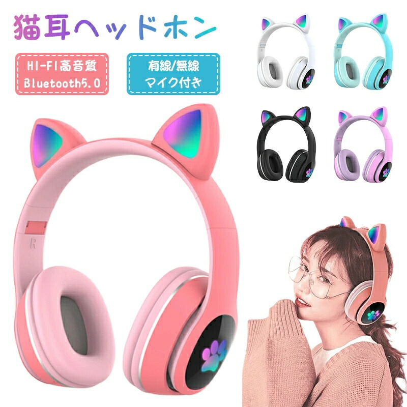 ヘッドフォン ヘッドホン ワイヤレスLEDライト ネコ耳ヘッドフォン bluetooth5.0 マイク付き 猫耳 ワイヤレスヘッドフォン 有線 ゲーミングヘッドセット