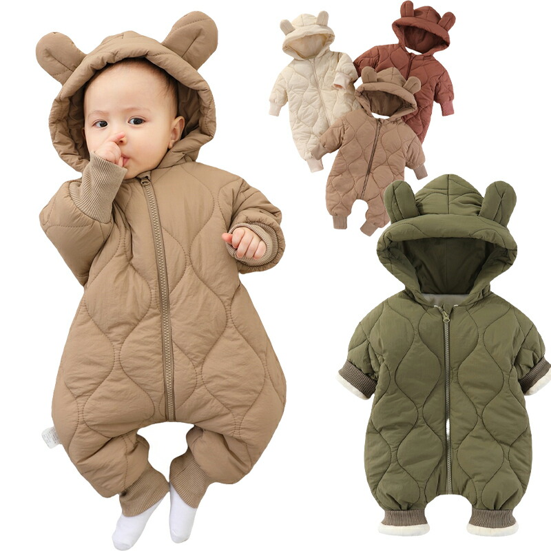 ベビー ロンパース 冬 キルティング カバーオール 厚手 男の子 女の子 ジャンプスーツ 起毛 防寒対策 暖かい もこもこ ふわふわ 可愛い フード付き 前開き 赤ちゃん服 出産祝い プレ 着替え便利