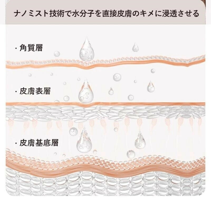 ナノミストテクノロジー: お肌に直接働きかけるナノミストが、効果的な加湿を実現し、お肌の奥深くまで水分を浸透させ、持続的な潤いを与えます。
