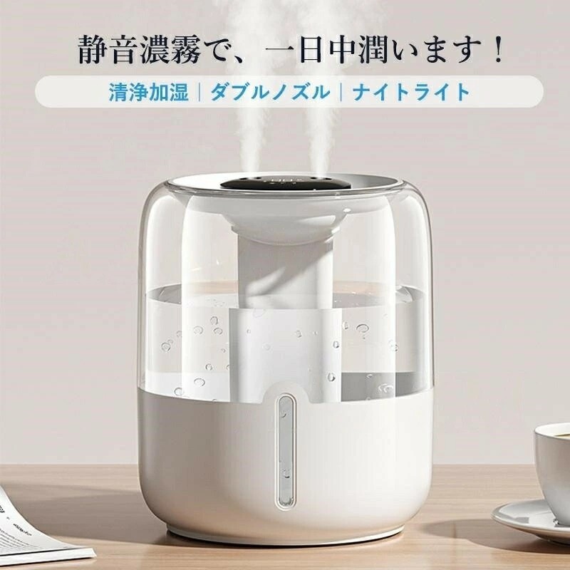 デュアルミストデザイン: 2つの噴霧口があることで、加湿性能が2倍に向上し、環境の湿度に合わせて調節することができます。