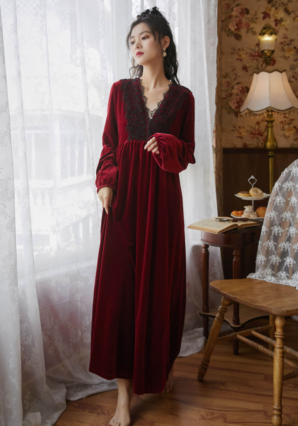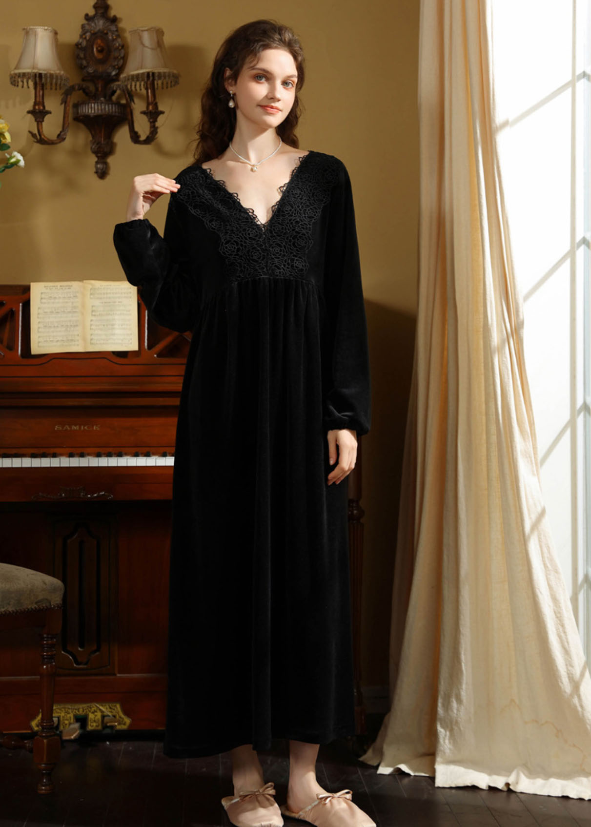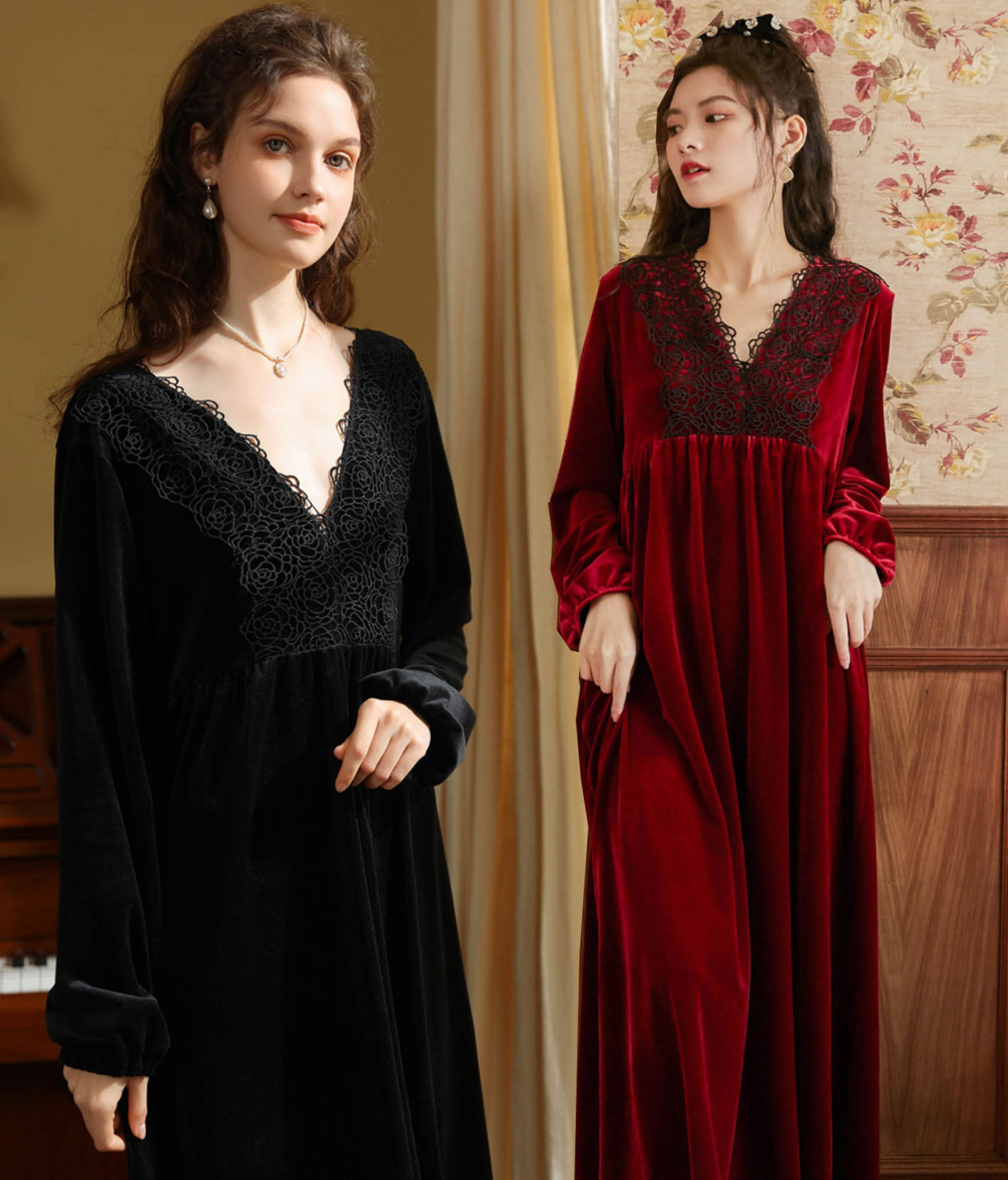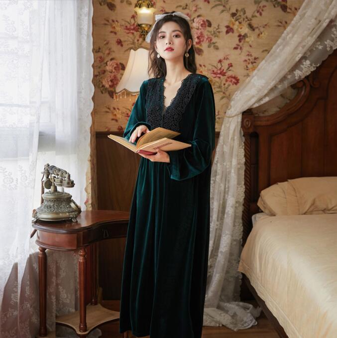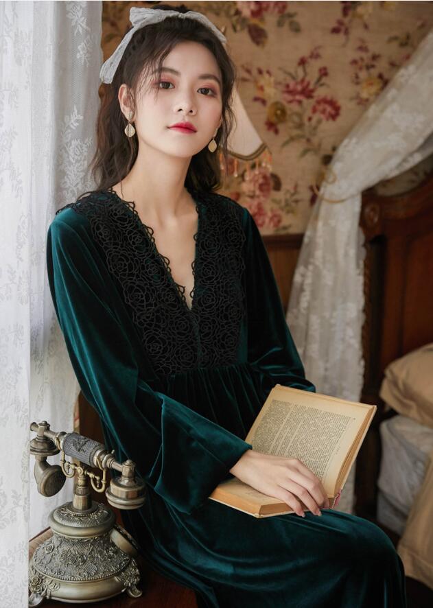 秋冬向け ネグリジェ レディース 長袖 レディース ナイトウェア ルームウェア ネグリジェ 早い者勝ち ブラック ワインレッド ダークピンク ダークグリーン M L XL