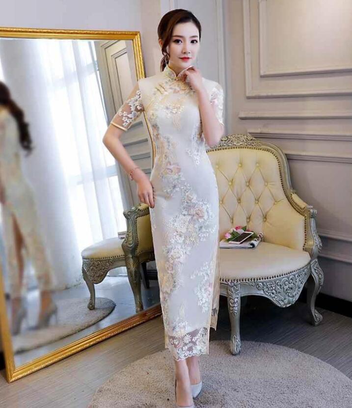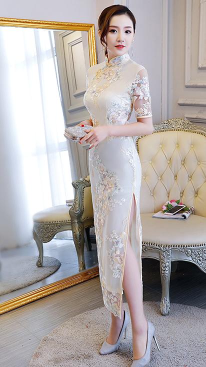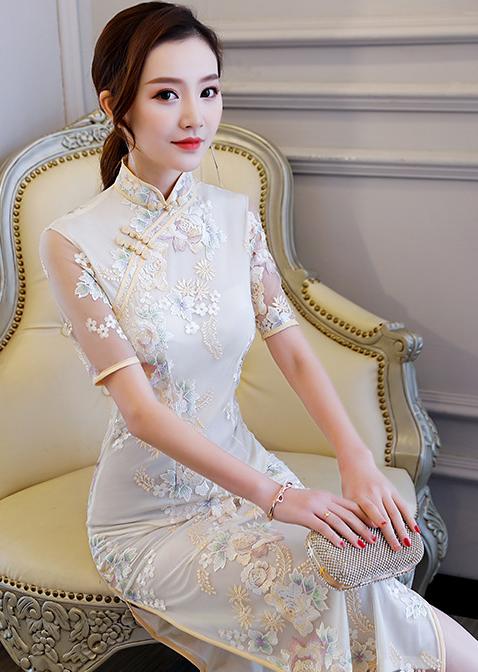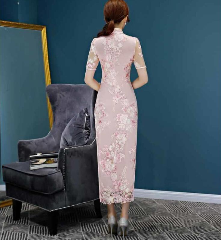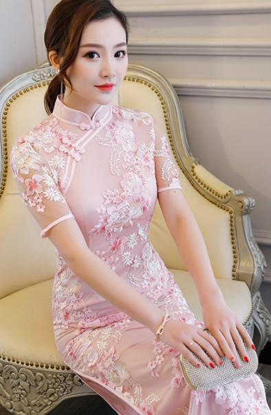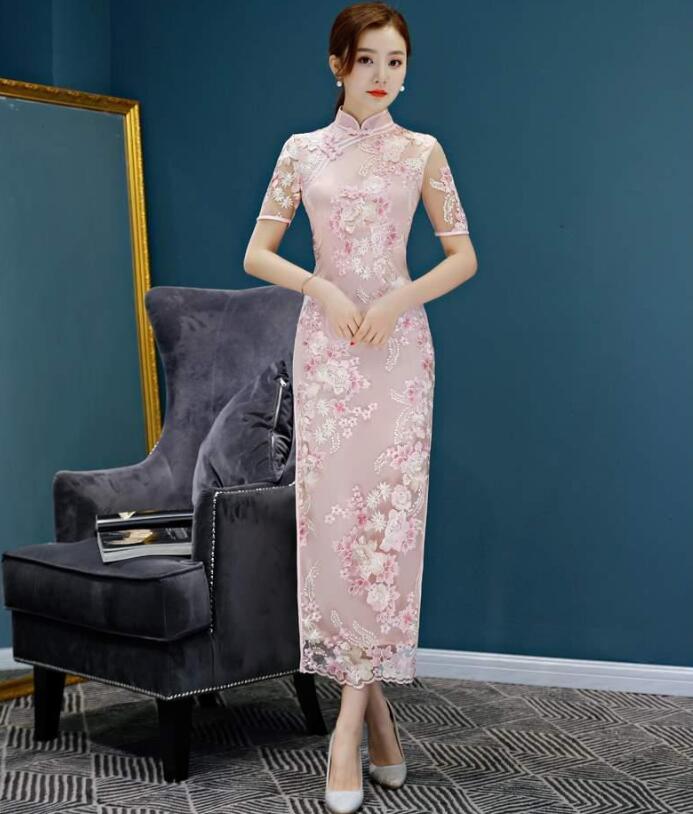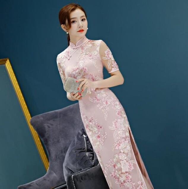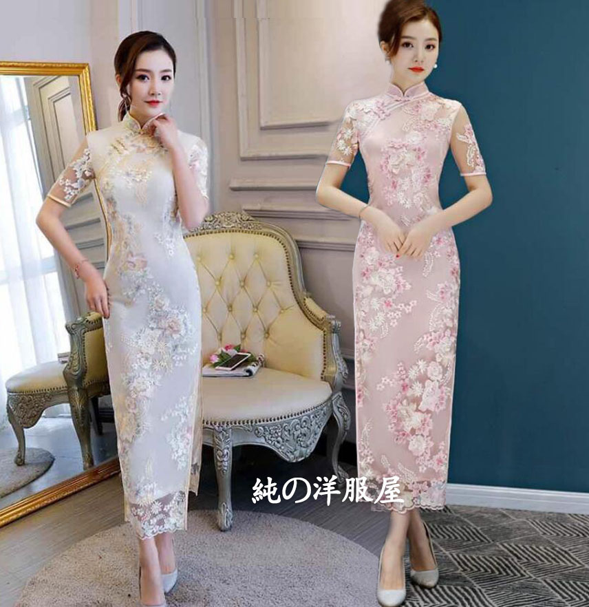 ロング チャイナドレス 半袖 チュール ドレス 続々登場 ピンク シャンパン S M L XL 2XL 3XL 4XL 5XL