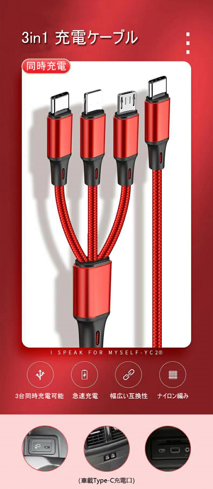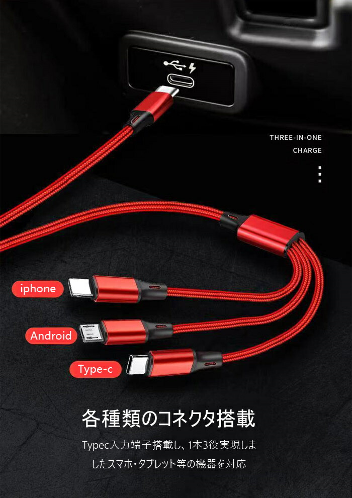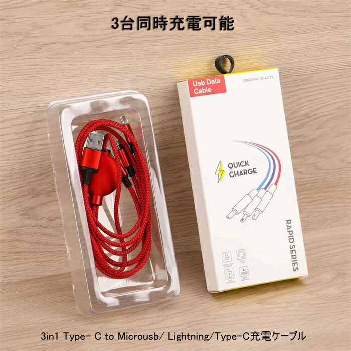 充電ケーブル 超急速充電 1.2m Type-C タイプC 3in1 Apple IOS Lightning MicroUSB スマトフォン typec機種 Android
