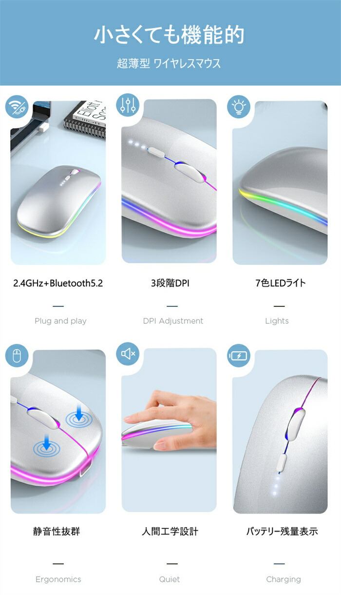 充電式 ワイヤレス 7色led 光学式 発光版(ブラック) 発光版(ホワイト) 発光版(グレー) 発光版(シルバー) 発光版(ゴールデン) 発光版(ローズゴールド) 非発光版(ブラック) 非発光版(ホワイト) 非発光版(グレー) 非発光版(シルバー) 非発光版(ゴールデン) 非発光版(ローズゴールド)