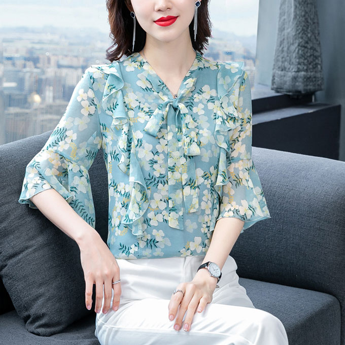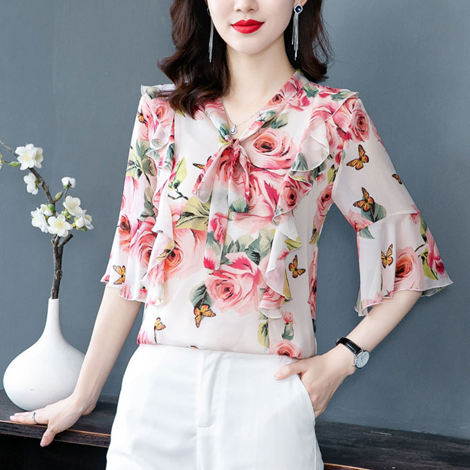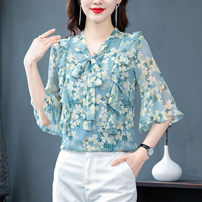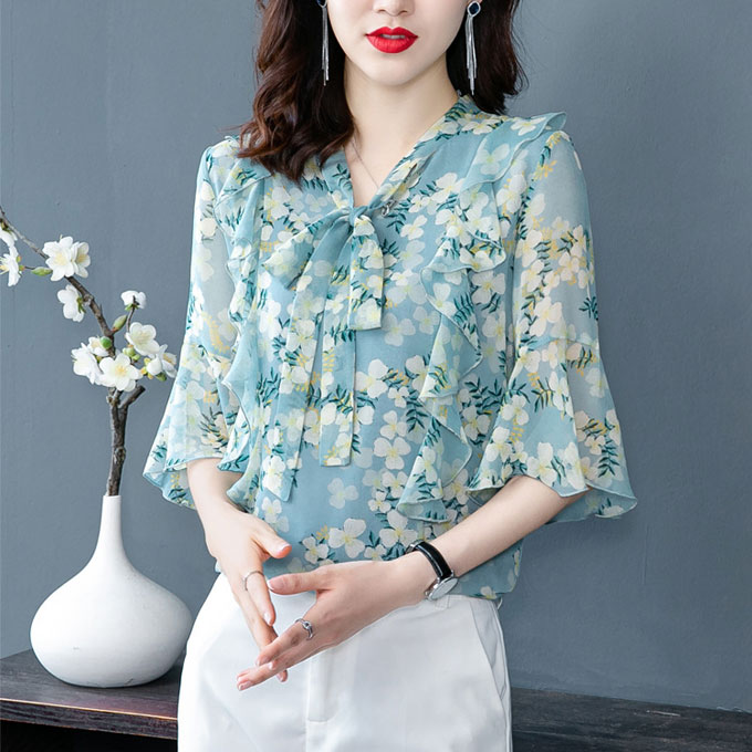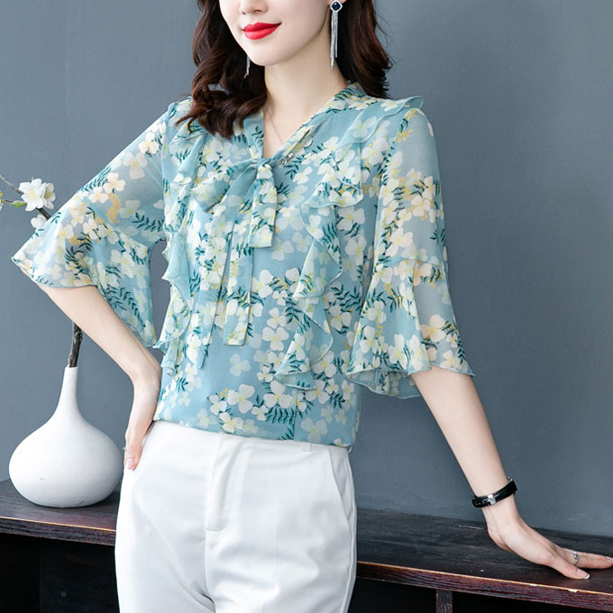 シフォンブラウス レディース 薄手花柄 トップス シャツ ブラウス 超目玉商品 ブルー ピンク S M L XL 2XL 3XL 4XL 5XL