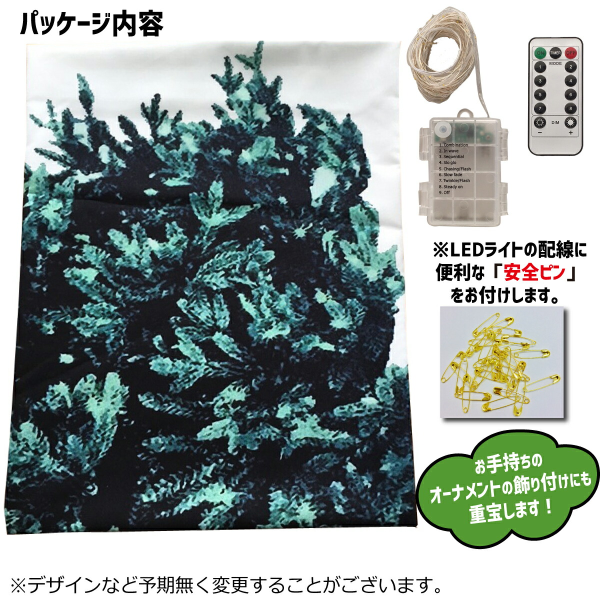 【セットのイルミネーションライトで十分クリスマスムードが演出できますが、お好みのオーナメントを画鋲や安全ピンなどで簡単に飾れます。】