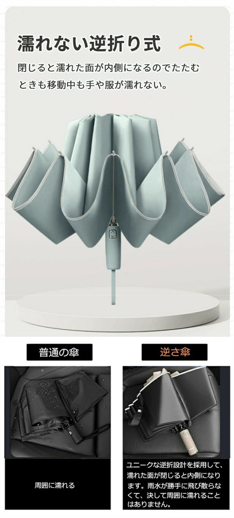逆さ傘 折りたたみ傘 自動開閉 10本 傘 男女兼用雨傘 続々登場 ライトグリーン ピンク ベージュ ダークグリーン ネイビー ブラック