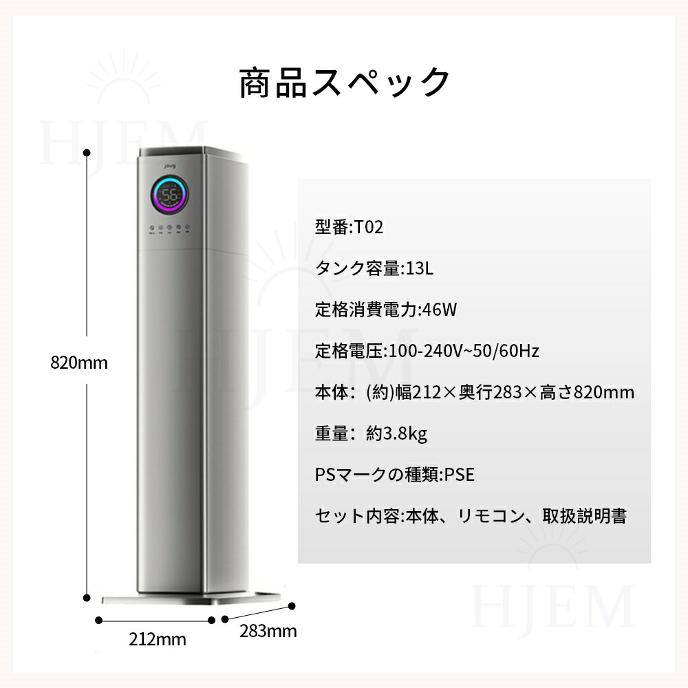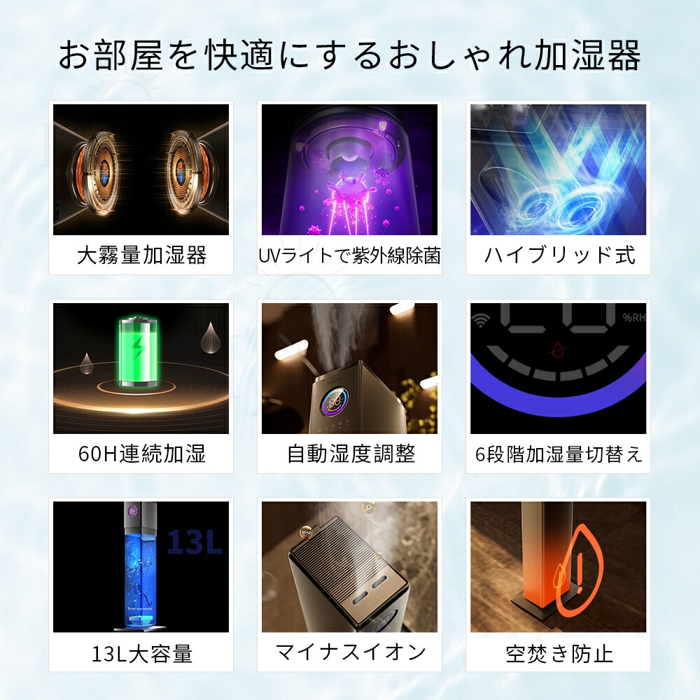 加湿器 加湿機 スチーム式 超音波式 大容量 13L おしゃれ 空気清浄 UV除菌 湿度センサー タワー型 自動湿度調節 6段階調節 最大噴霧量1000ML H 40畳 静音 節電 省エネ 空焚き防止