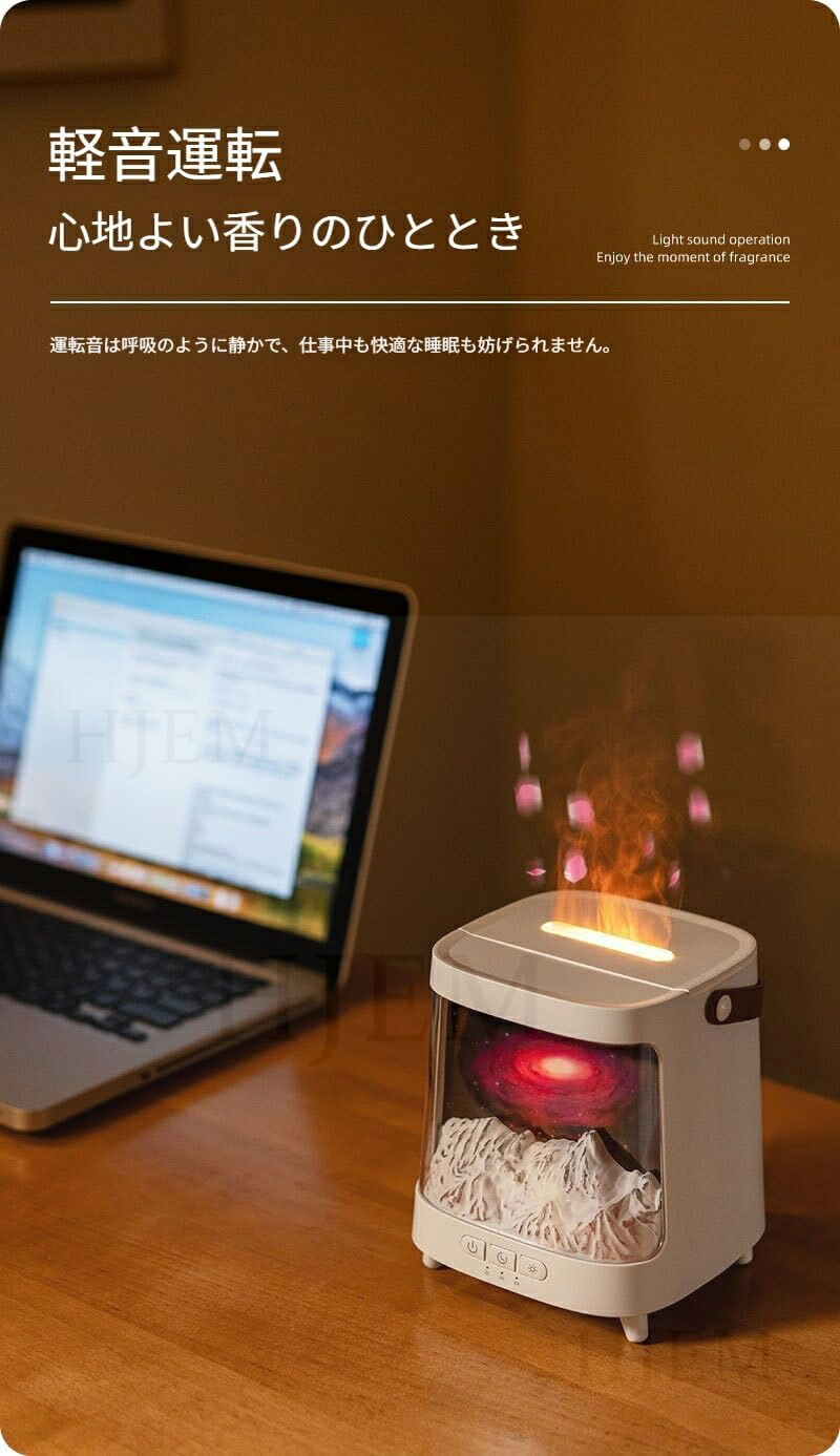 この超音波加湿器は、独自の擬似炎効果で、深いリラックス空間を演出します。内蔵のカラフルなLEDライトは、色と明るさを調整できます。コンパクトなデザイン(13×13×15cm)は卓上にぴったり。静音設計でオフィスやデスクの邪魔になりません。大容量の水タンクは乾燥を効果的に防ぎ、スタイリッシュな空間を演出します。