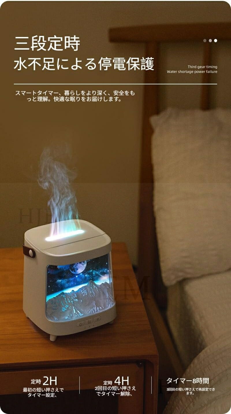 3段階タイマー(2/4/8時間)と自動オフ機能に加え、空焚き防止機能と自動停止機能を搭載し、長時間のご使用でも安心してお使いいただけます。省エネ設計で消費電力を抑え、乾燥対策にも効果的です。大容量タンクで連続運転も可能なので、寝室やオフィスに最適です。アロマディフューザーとしてだけでなく、加湿機能も充実しています。