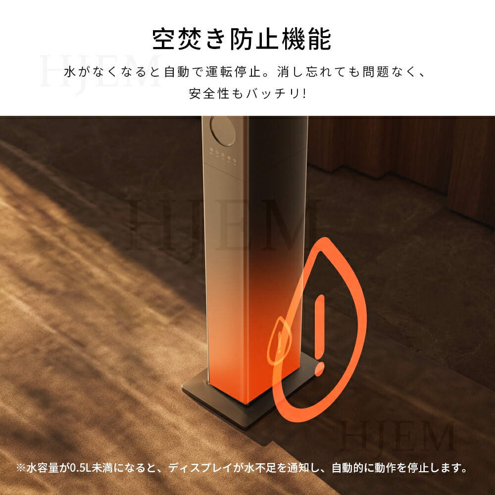 1時間単位で最大8時間まで設定可能なタイマー機能と、ソファやベッドからでも操作できる便利なリモコン(有効距離10m)を搭載しておりますので、離れた場所からでも簡単に操作を行うことができます。さらに、水がなくなると自動で運転を停止する空焚き防止機能と、万が一本体が転倒した場合にも自動で電源が切れる転倒時自動停止機能を備えており、二重の安全対策が施されておりますので、安心してご使用いただけます。直感的なLEDディスプレイも搭載されており、現在の状態が一目で確認できますので、操作の煩わしさを感じさせません。
