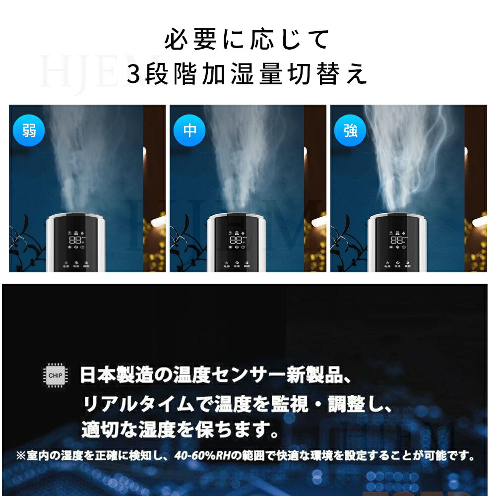 3 段階(300ml/h):秋冬の乾燥シーズン用急速加湿、短時間で乾燥環境を改善します スマート恒湿システムを搭載し、デフォルトで湿度 40% を起点とし、5% 刻みで 90% まで調整可能。設定後、機器は自動的に環境湿度を監視し、湿度が目標値に達すると噴霧を一時停止し、目標値を下回ると自動的に再起動して、快適な湿度範囲を精密に維持します。特別注意:過度な加湿はカビの発生を助長しやすいため、季節に応じて調整することを推奨します(冬季は 40%-60%、夏季は 40%-50% が適切です)。室内の湿気が過度に高くなることを避けてください。