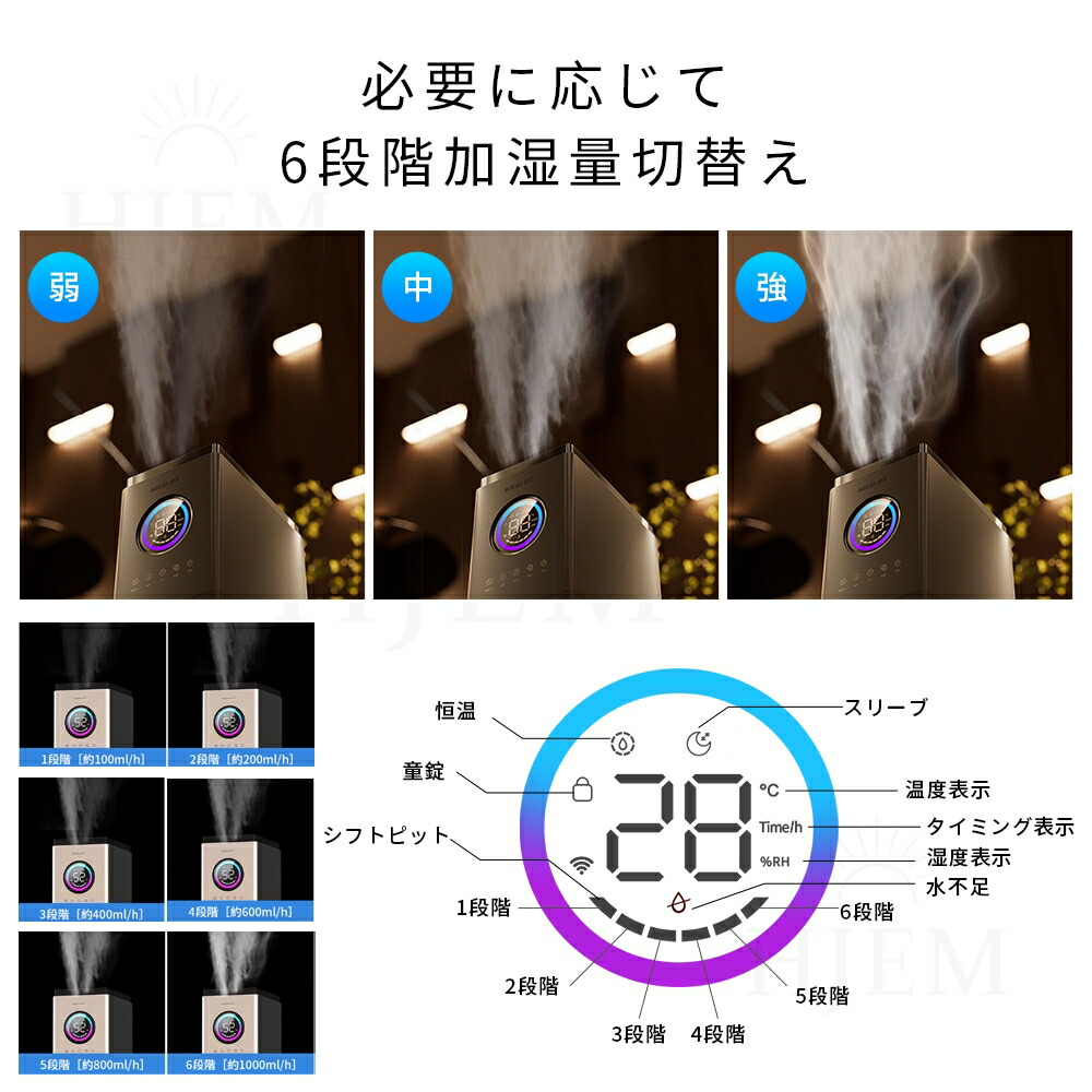 6つの加湿レベルを調整可能:この床置き大容量加湿器は6つの加湿レベルがあり、お仕事、快眠、リラックスのニーズによってお好みで切り替えることで、快適にお使いいただけます。最大530mL/hの微細なミストで連続加湿でき、ずっと潤っています。また、知能恒湿機能が付き、50%~70%の範囲で、ご希望の湿度をキープできます。環境湿度がご設定の湿度になると、自動的に噴霧を停止され、湿度がご設定の湿度に下がると、再び噴霧します。